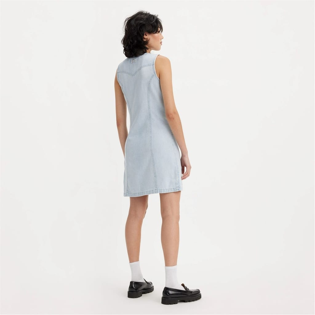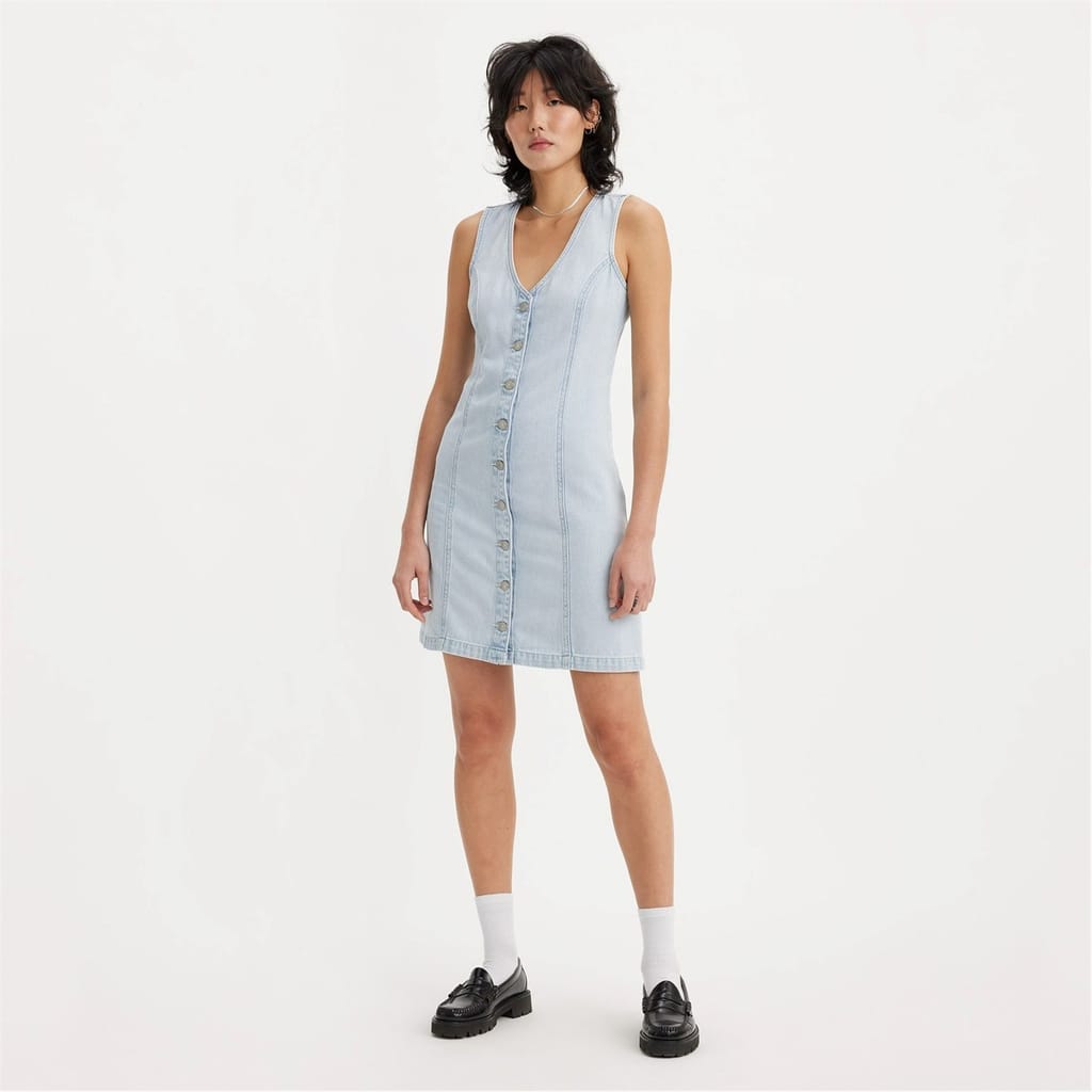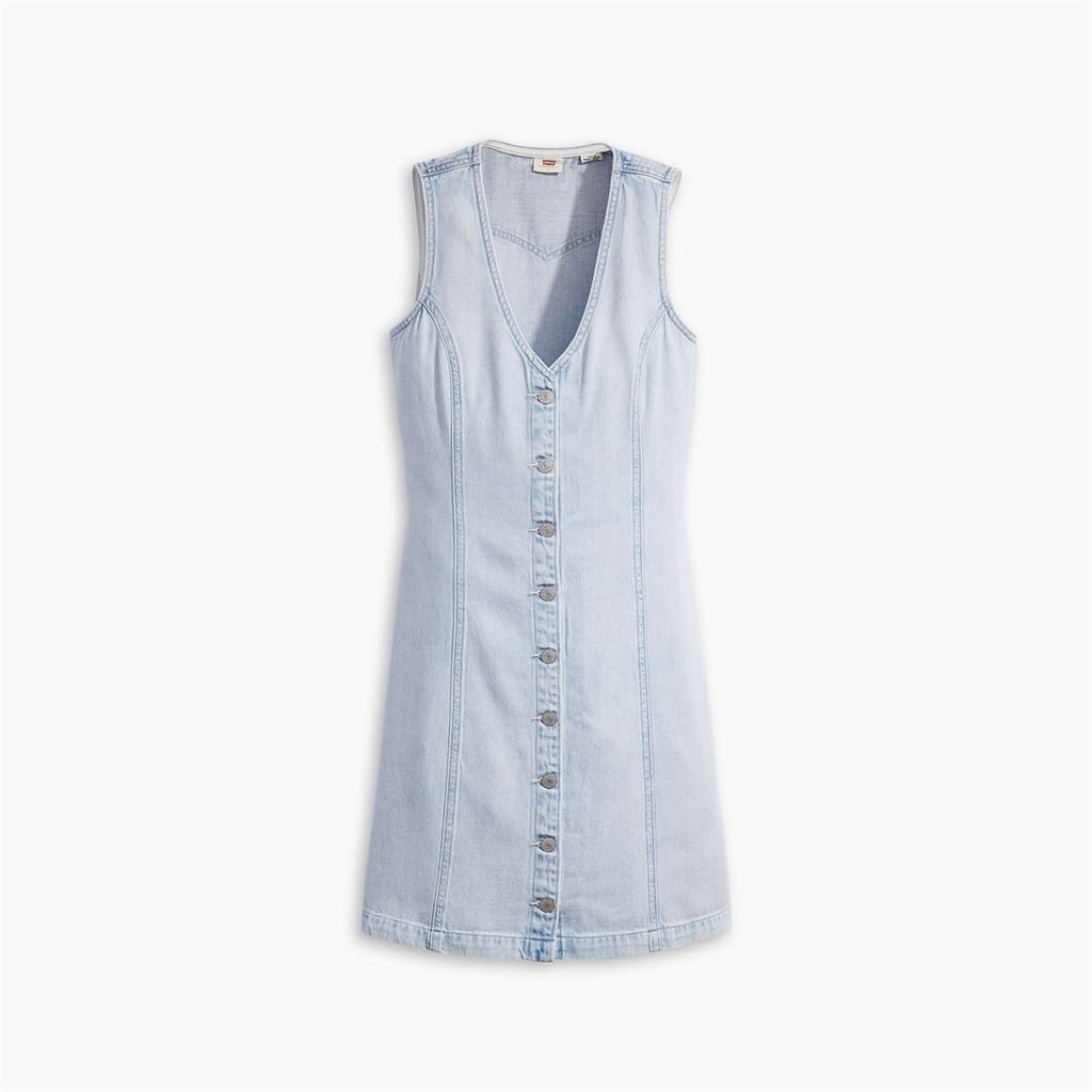 - Crafted from luxurious cotton denim, this fitted dress effortlessly combines 90s-inspired comfort and style. The v-neckline adds a touch of sophistication, while the mini length adds playful character, perfect for any occasion. With its sleeveless design and button-down front, this dress exudes effortless elegance. The flattering hemline detailing adds a unique and feminine touch, perfectly highlighting your silhouette. And for that subtle touch of Levis heritage, discover a discreet embroidered logo on the back. Whether attending a garden party or a casual brunch with friends, this dress is designed to make you feel confident and stylish. Care: Machine washable, see care for instructions. -