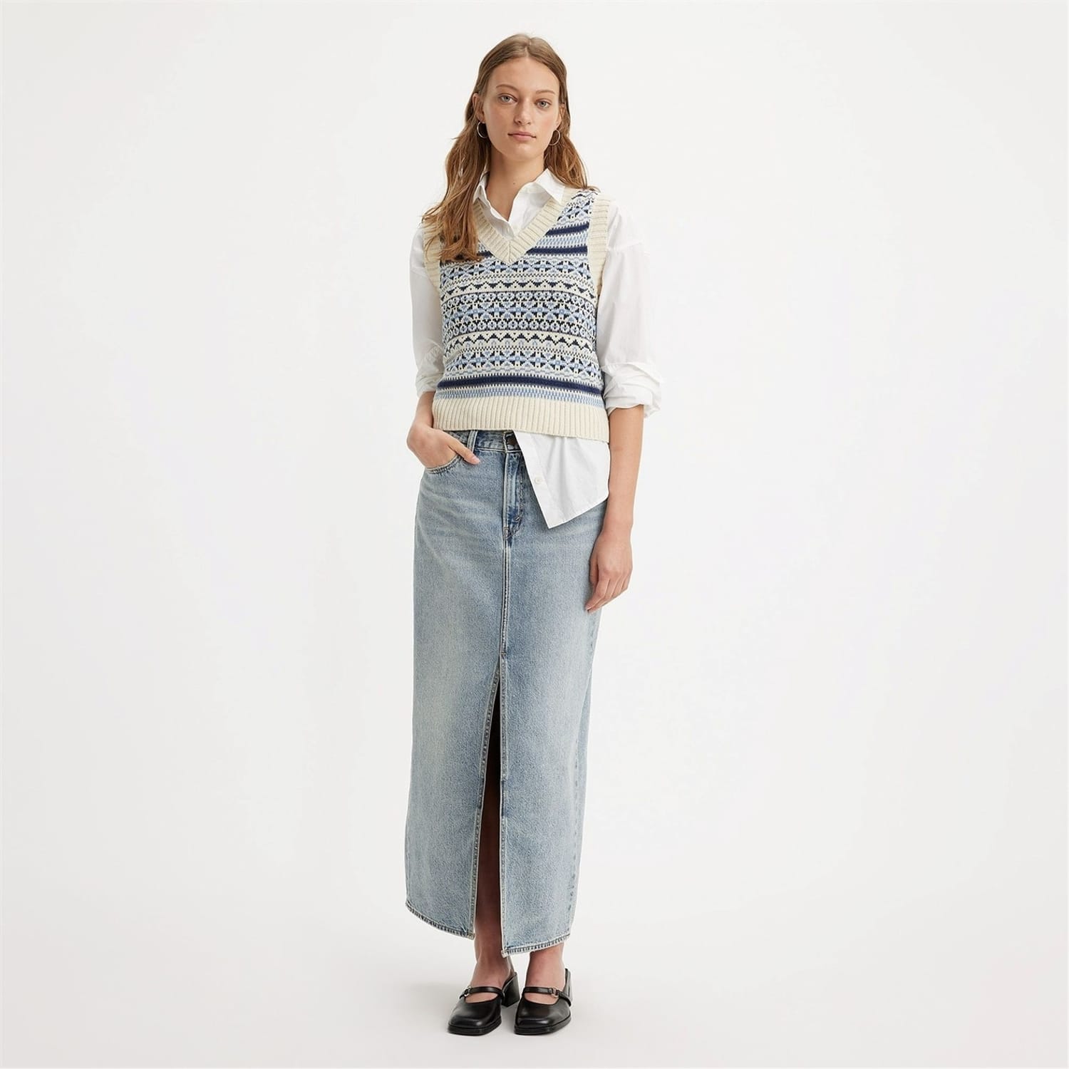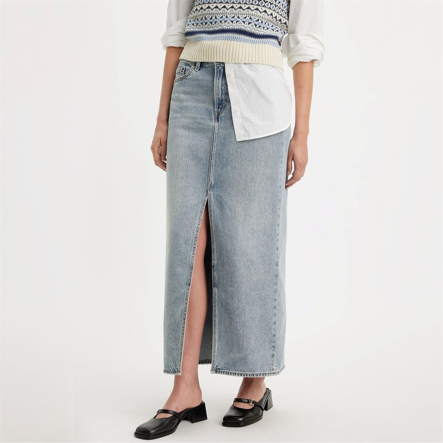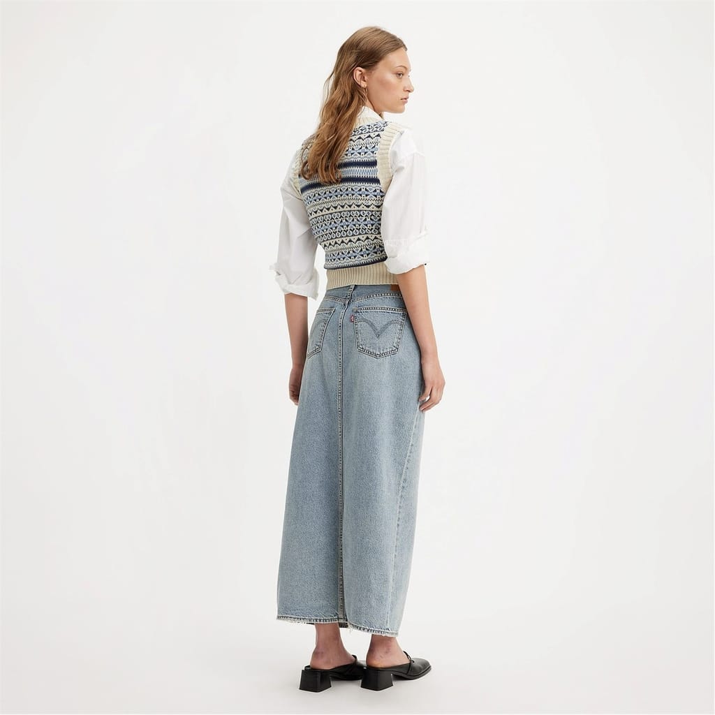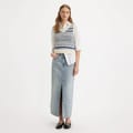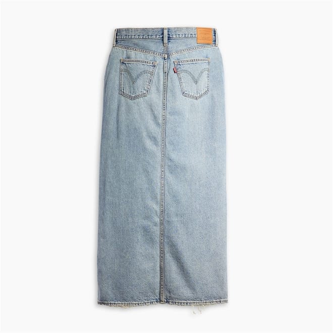 This Levis maxi skirt combines casual style with a classic mom skirt design. Featuring a button closure and regular fit, it includes practical embellishments such as logo detailing, front split, pockets, and stitching. Perfect for relaxed, everyday wear. -