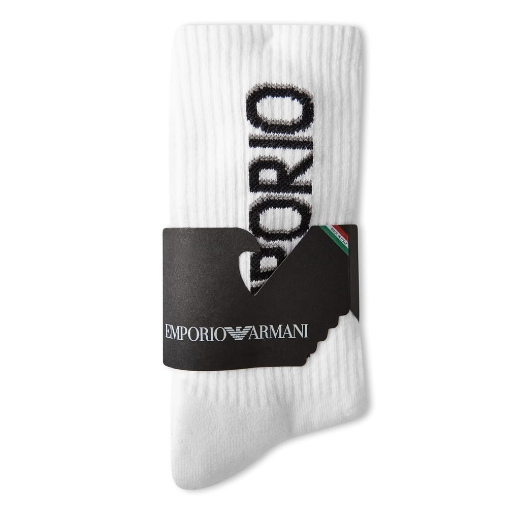 Emporio Armani crew socks feature a distinctive logo print and lettering graphic, offering a stylish touch to your sock collection. These socks are designed with a focus on quality and comfort, making them a reliable choice for everyday wear. The logo embellishment adds a subtle yet sophisticated element to these essential crew socks. -