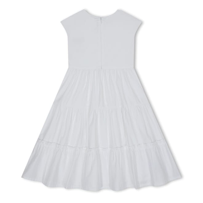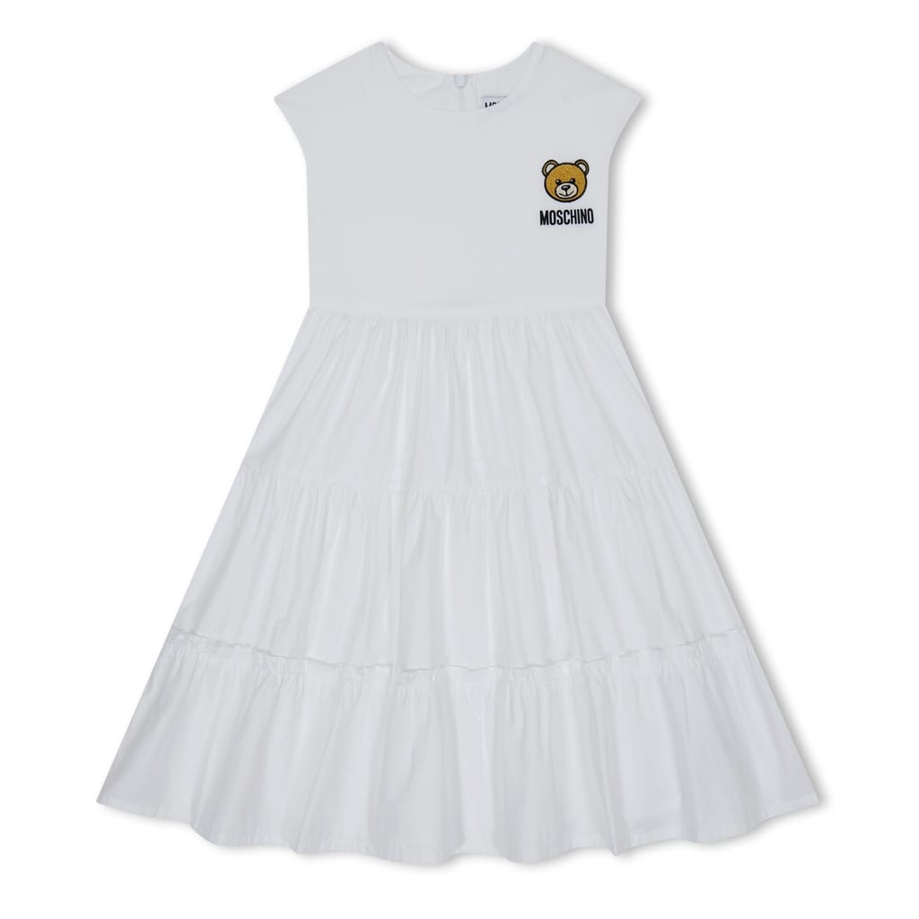 - Fastened with a concealed rear zip fastening, the dress's polished aesthetic is maintained while ensuring dressing time is as seamless as possible. Adding Moschino's signature touch of luxe, the embroidered signature Teddy Bear motif adorns the chest, providing a playful flair which speaks to the house's iconic aesthetic. Designed at a below-the-knee length, this cotton dress exudes timeless elegance, making it the ideal choice for family gatherings, garden parties, -