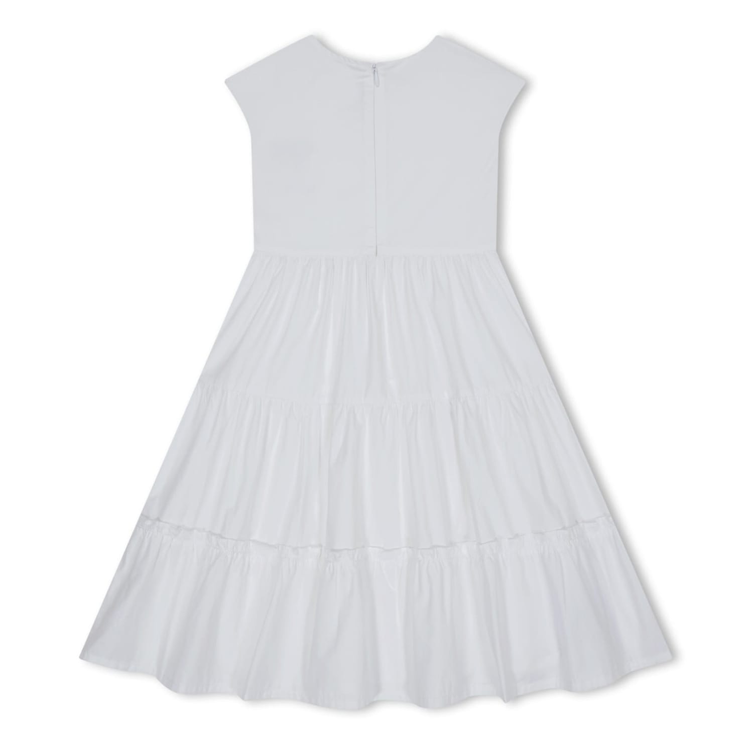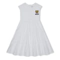 Let your little one enjoy summer in style with the charming Teddy Bear Embroidered Dress by Moschino, a luxurious addition to your child's warm-weather wardrobe. Meticulously crafted from pure cotton with a poplin texture, this kid's dress provides a soft and lightweight feel, making it perfect for those exciting sun-filled days. Its round neckline and sleeveless design ensure comfort and unrestricted movement, while the tiered skirt and flared hem create a whimsical movement that your little one will love.