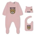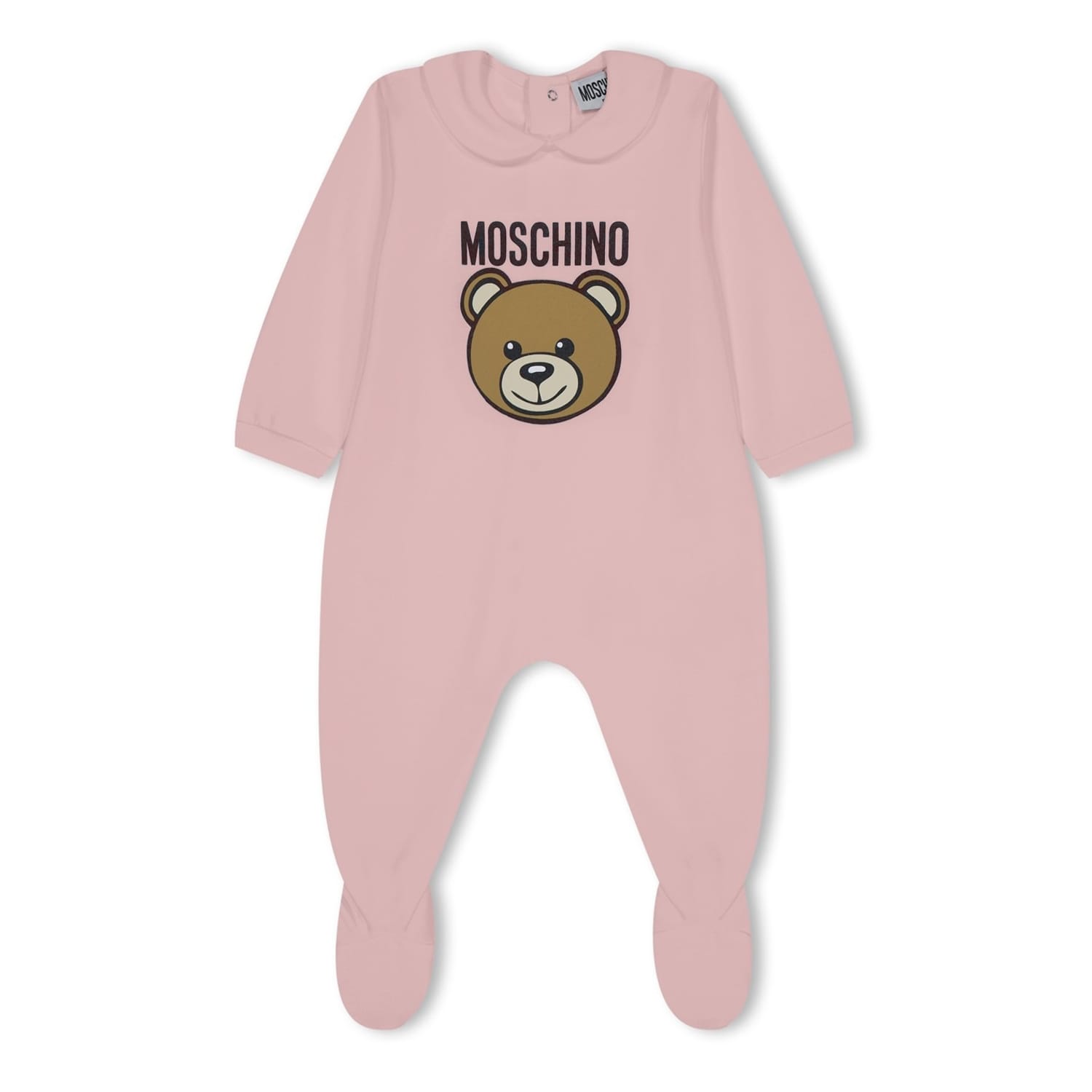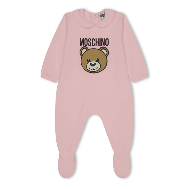 - The solid block colouring throughout, coupled with the prominent Moschino bear and lettering, exudes sophistication and exclusivity. Whether it's an intimate family gathering or a special occasion with loved ones, this all-in-one set will ensure that the newest member of your family will be the centre of attention!