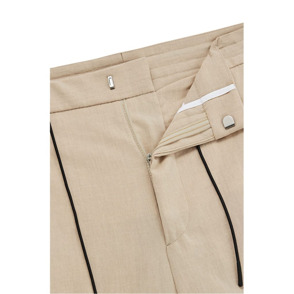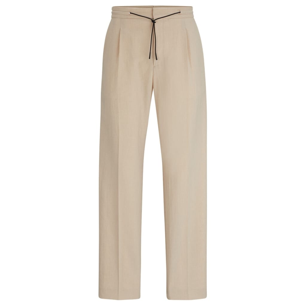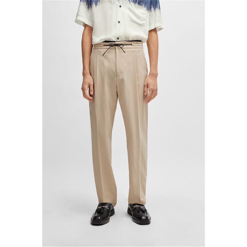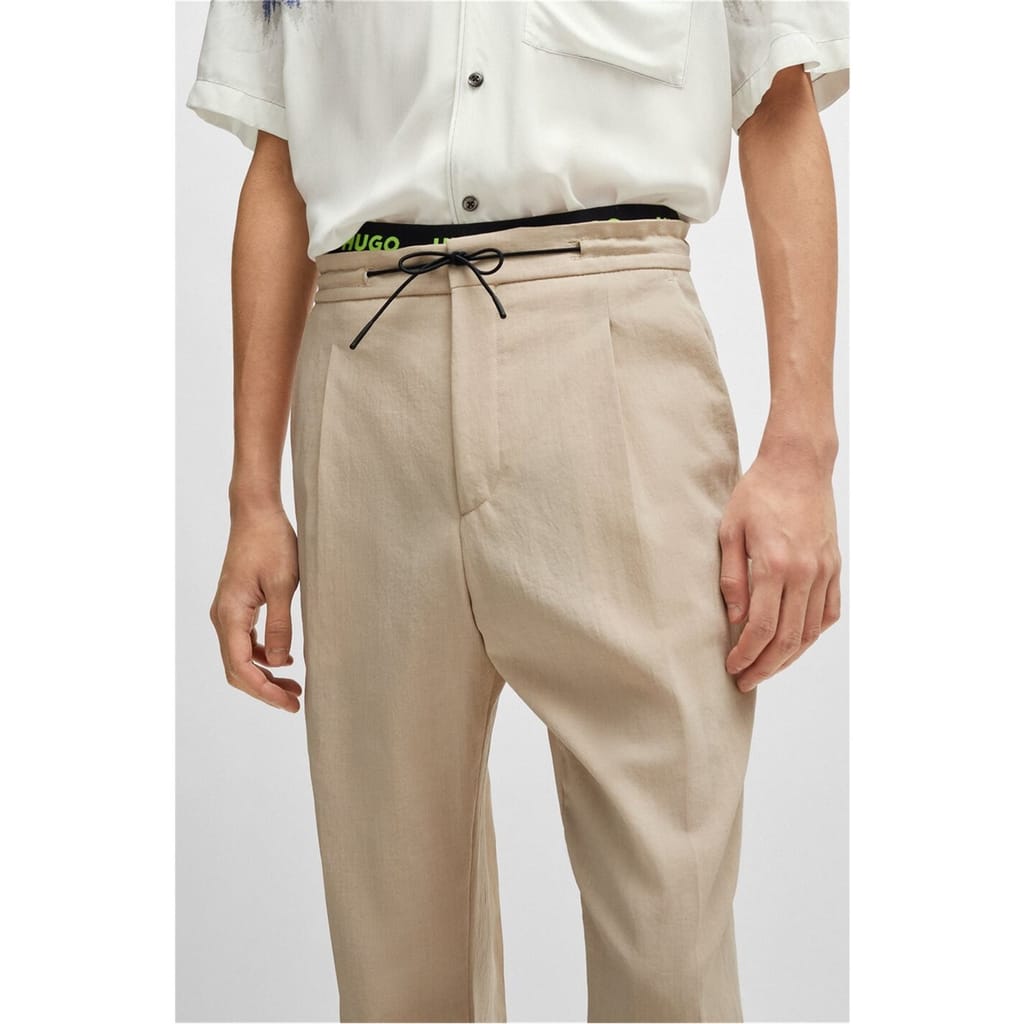 Discover the refined elegance of Hugo trousers, featuring a pleat design for a sophisticated touch. These pants offer a practical drawstring closure, complemented by a zip fly for added convenience. Perfect for those seeking a blend of style and functionality in their wardrobe. -