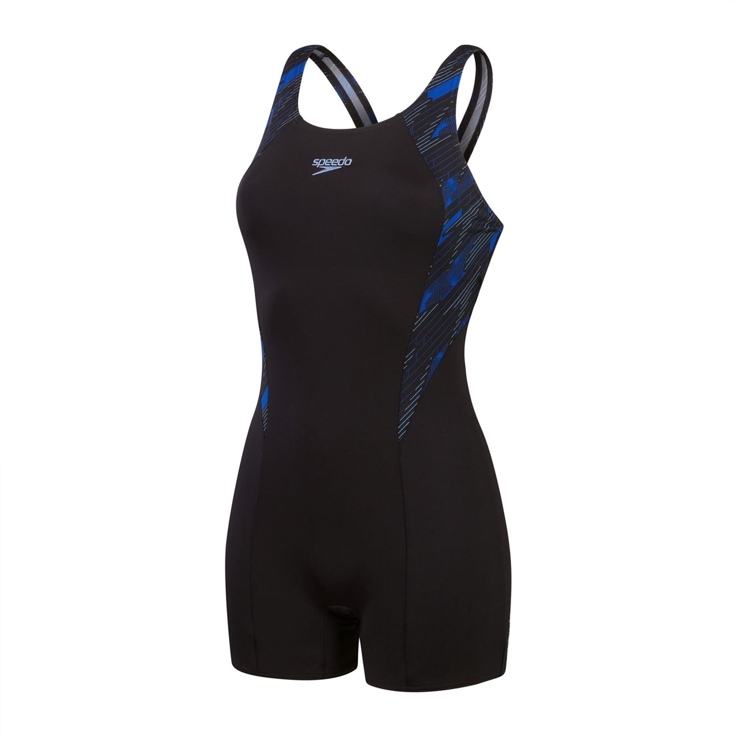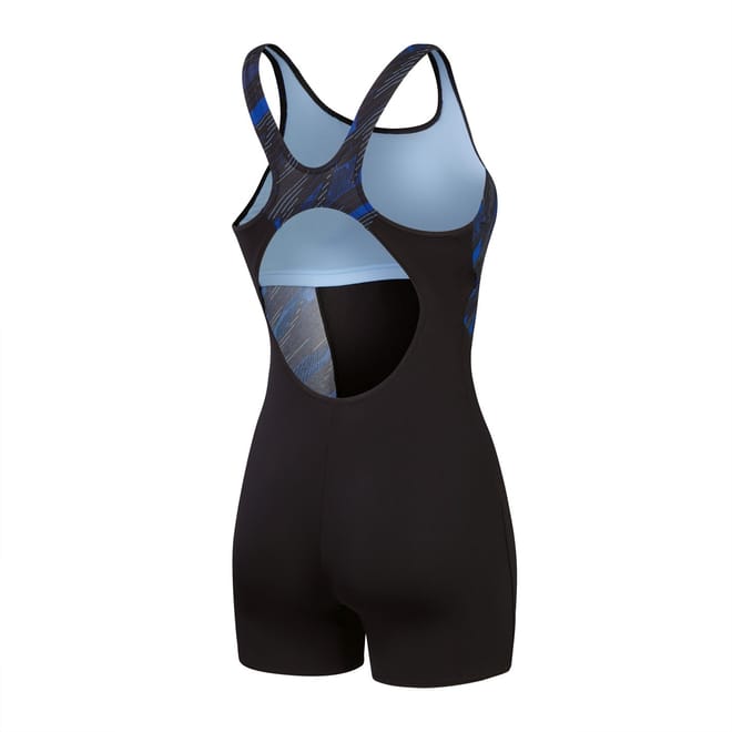 Make a statement in HyperBoom logo prints. Paying homage to our legacy graphics, this sporty black Legsuit features flattering shaped side panel splices of our evolutionary HyperBoom logo print in intense shades of blue. The legsuit is ideal for swimmers seeking extra coverage and includes a bust shelf liner for light support during your workout. Made from our durable Endurance+ fabric, it's quick-drying and 100% chlorine resistant. Plus, one of the yarns in this fabric is made from 100% post-consumer waste, such as recycled plastic bottles. -