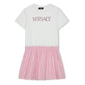 - For youngsters who adore luxury and glamour, this dress is crafted from a premium cotton blend, offering comfort to its wearer. The dress is designed with a regular fit and mini length, giving it an effortlessly chic vibe that is timeless yet always in trend. The ribbed crewneck and short sleeves enhance the dress's clean and simple design, providing an unpretentious yet gorgeous look. An elasticated waistband accentuates the figure while the all-over Barocco print and logo lettering crystal embellishments on the chest amplify the dress's allure.
