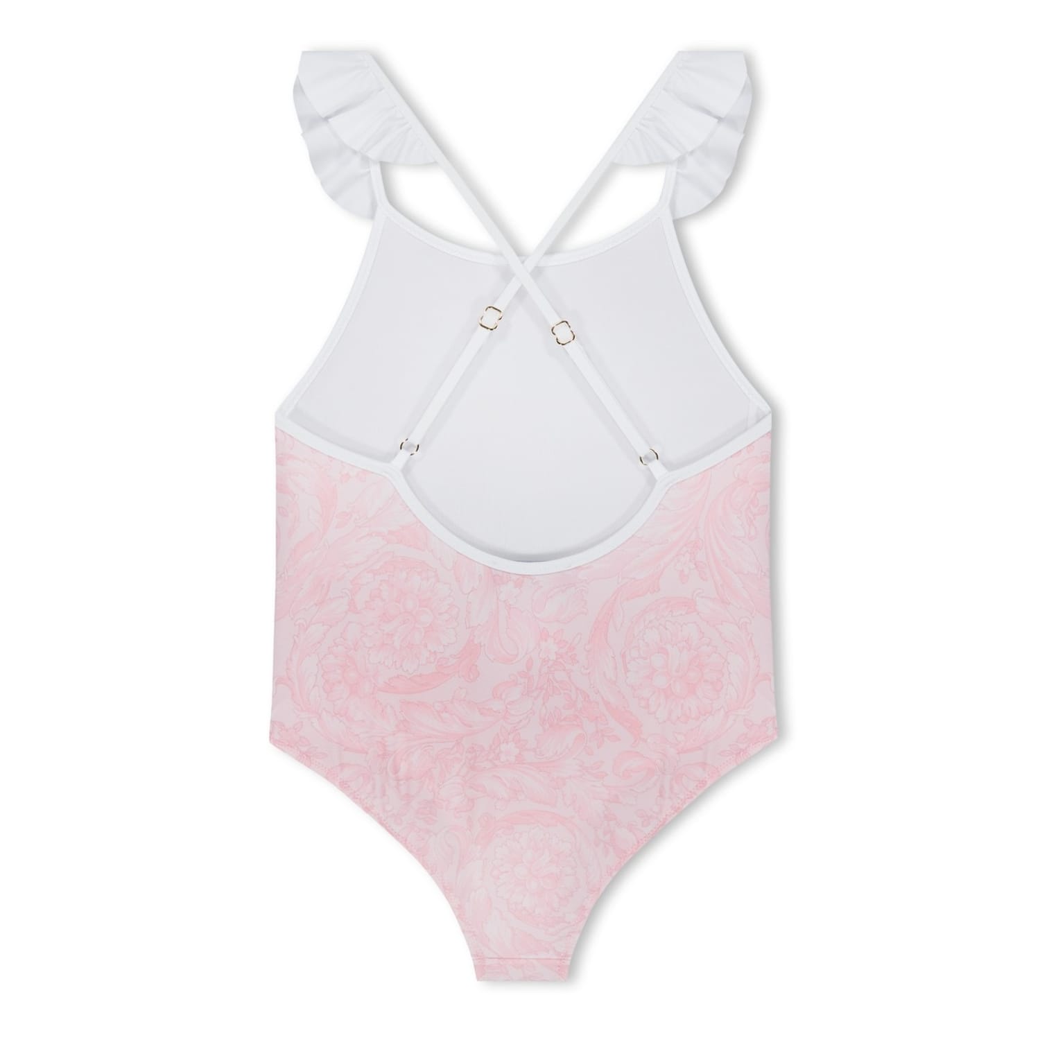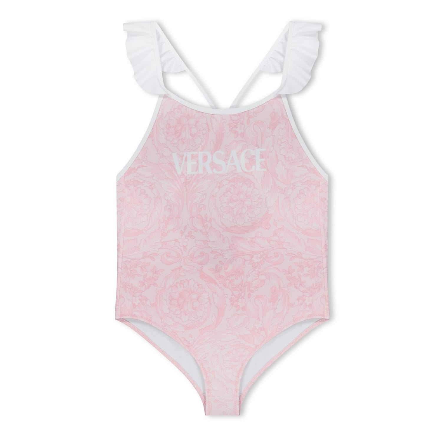- No Versace design would be complete without its iconic Barocco print, complementing the solid girly colourway with Grecian and Roman flourishes. For an elevated finishing touch, the house's signature wordmark is delicately printed across the chest for instant brand recognition. Whether she is swimming lengths in the pool or paddling in warm tropical seas, Versace's Barocco Logo Swimsuit is the epitome of luxury and glamour for your child.