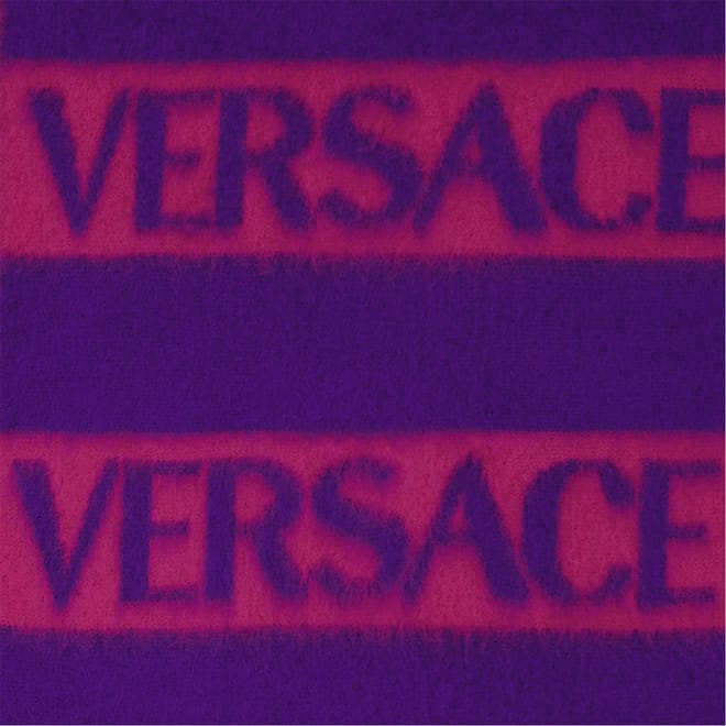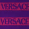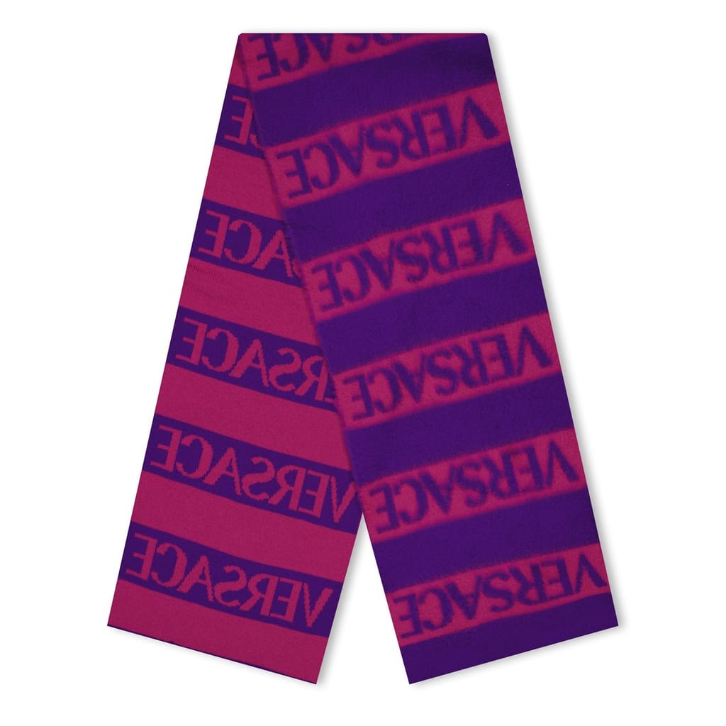 This Versace oblong scarf is designed for juniors, featuring a striking logo print pattern. The scarf showcases elegant lettering graphics and is adorned with the iconic Versace logo embellishment, adding a touch of sophistication to any outfit. -