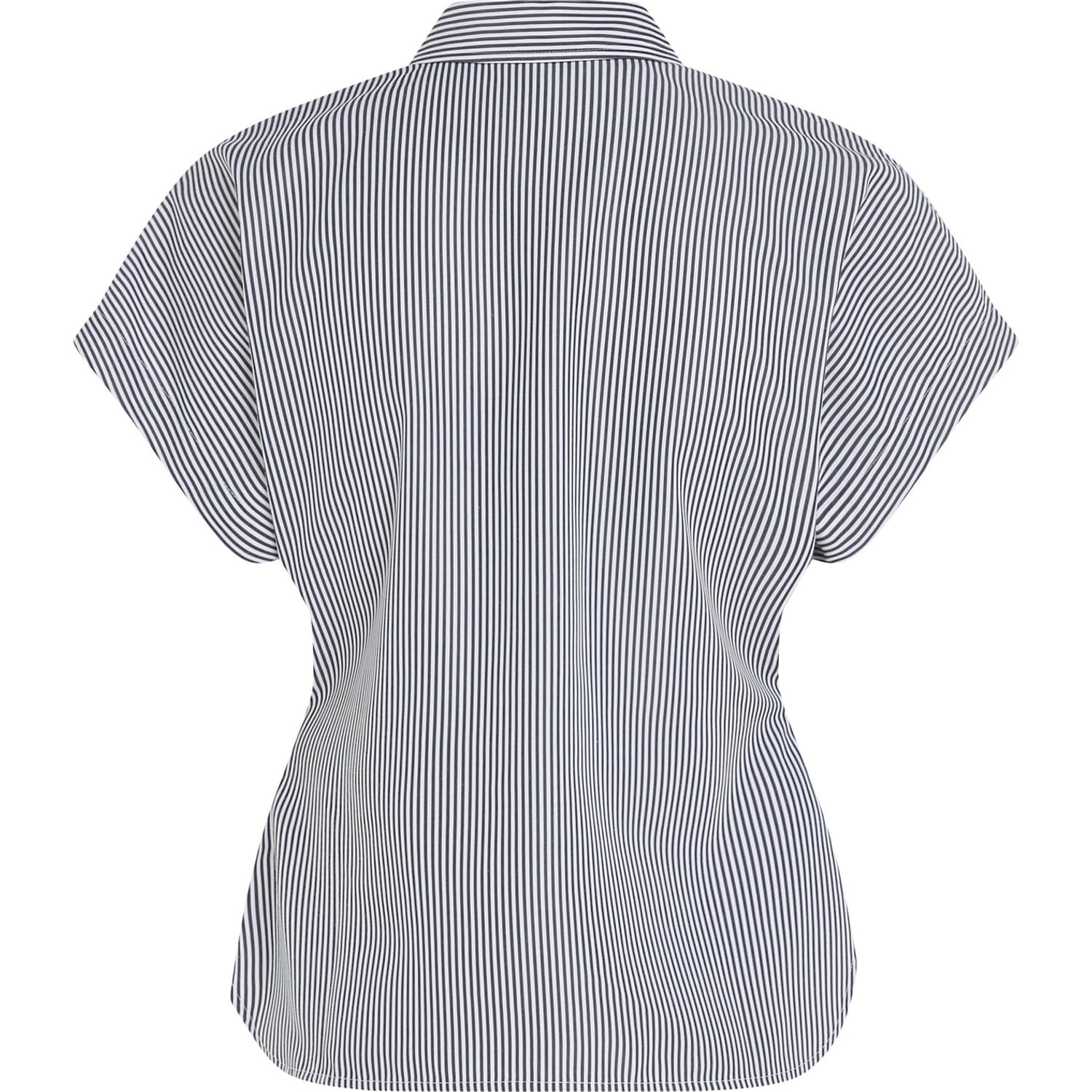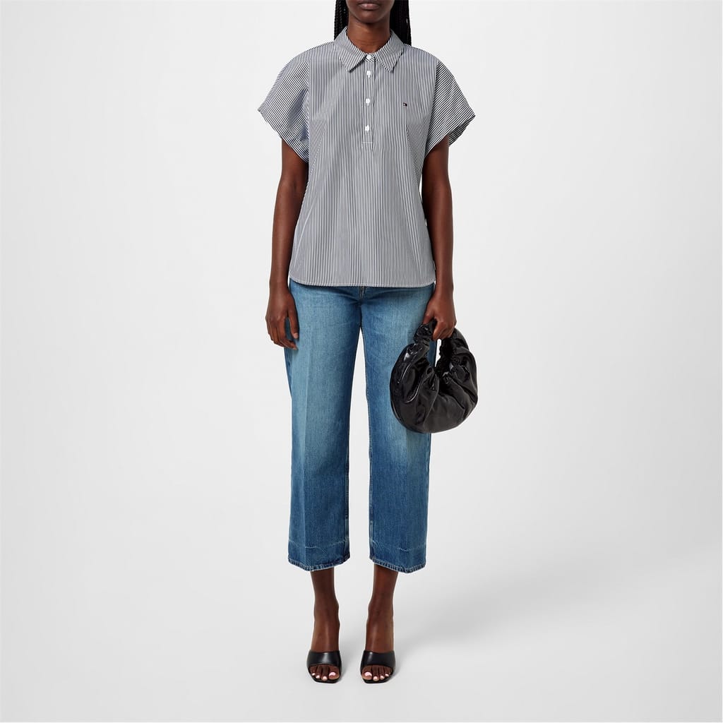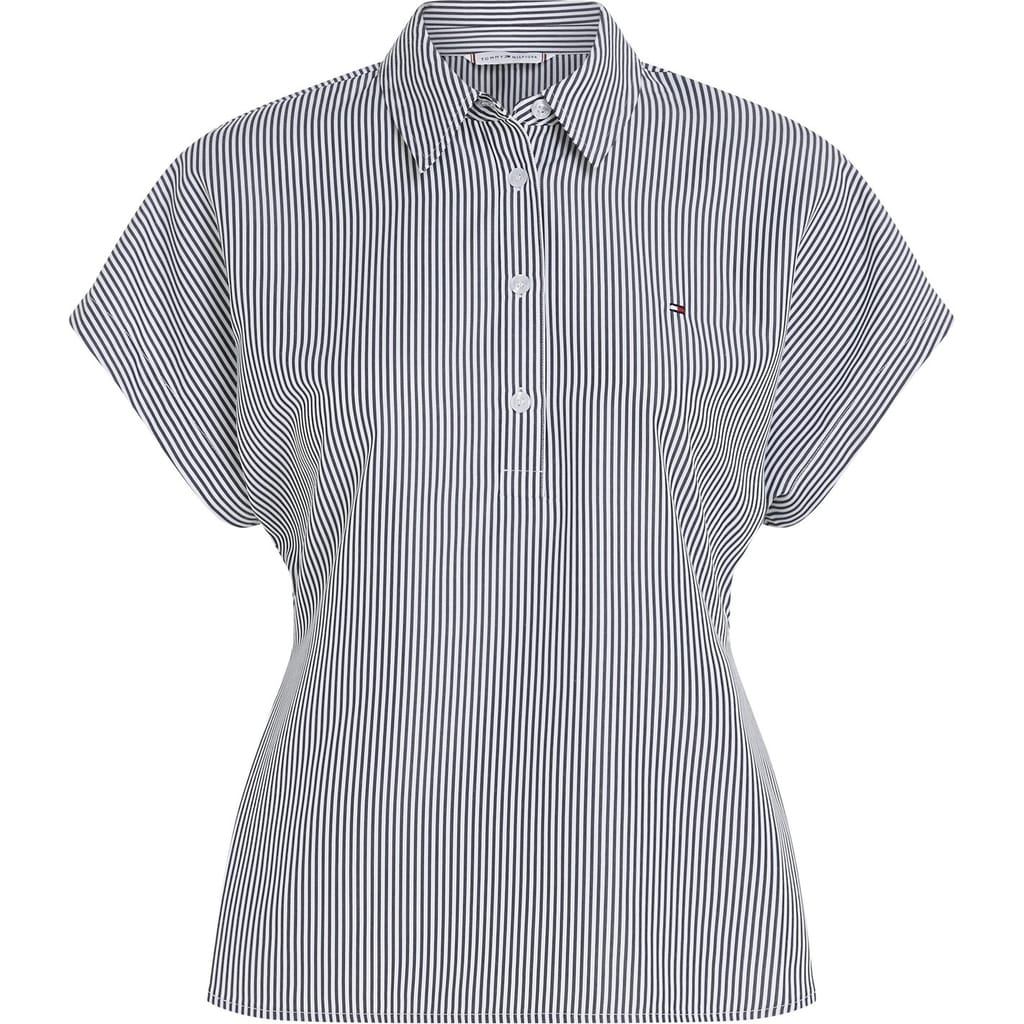 This Tommy Hilfiger blouse features a relaxed fit with short sleeves and a shirt collar. The vertical stripe pattern adds a classic touch, while the button-down closure ensures ease of wear. Perfect for a stylish and comfortable look. -