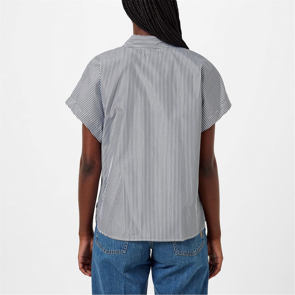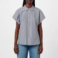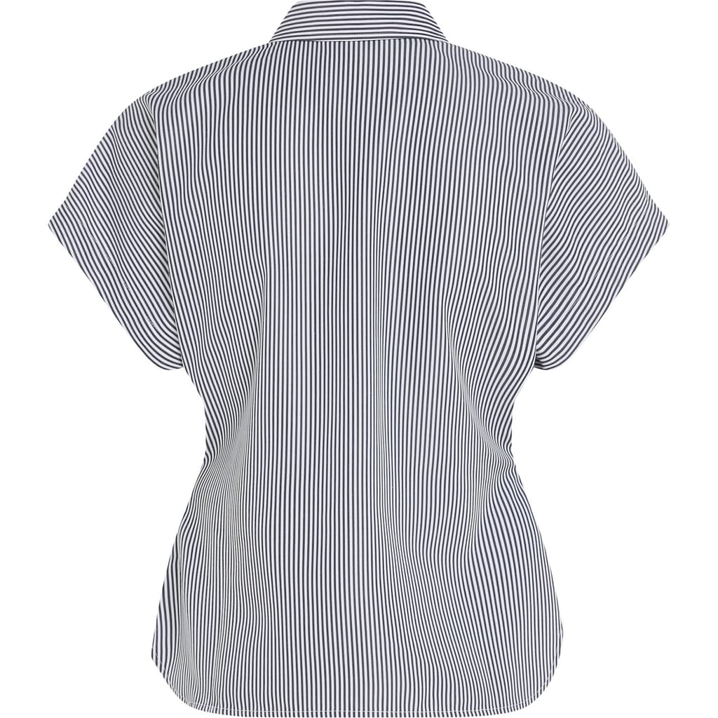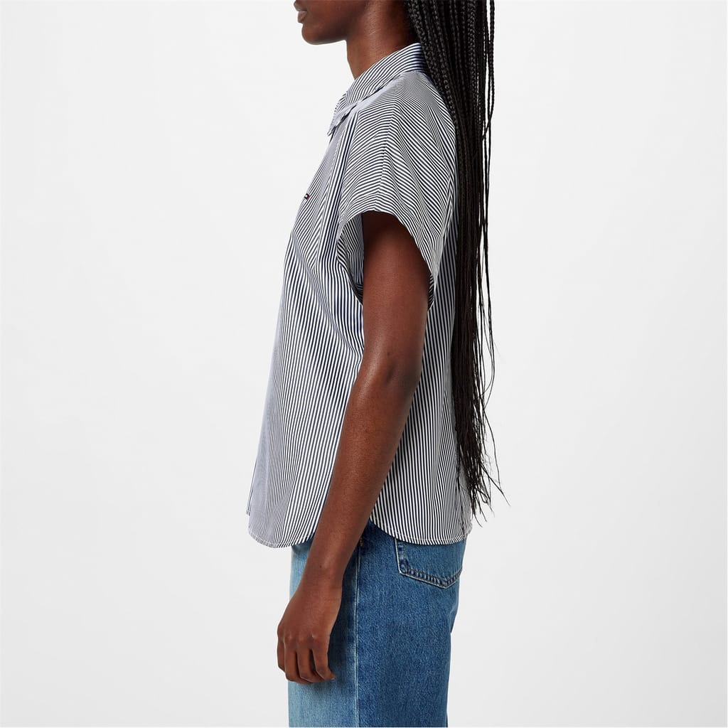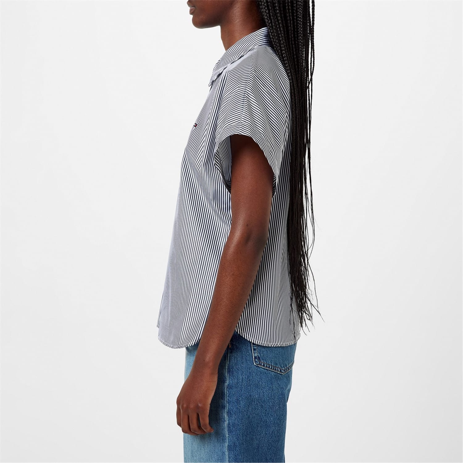 This Tommy Hilfiger blouse features a relaxed fit with short sleeves and a shirt collar. The vertical stripe pattern adds a classic touch, while the button-down closure ensures ease of wear. Perfect for a stylish and comfortable look. -