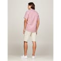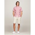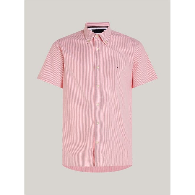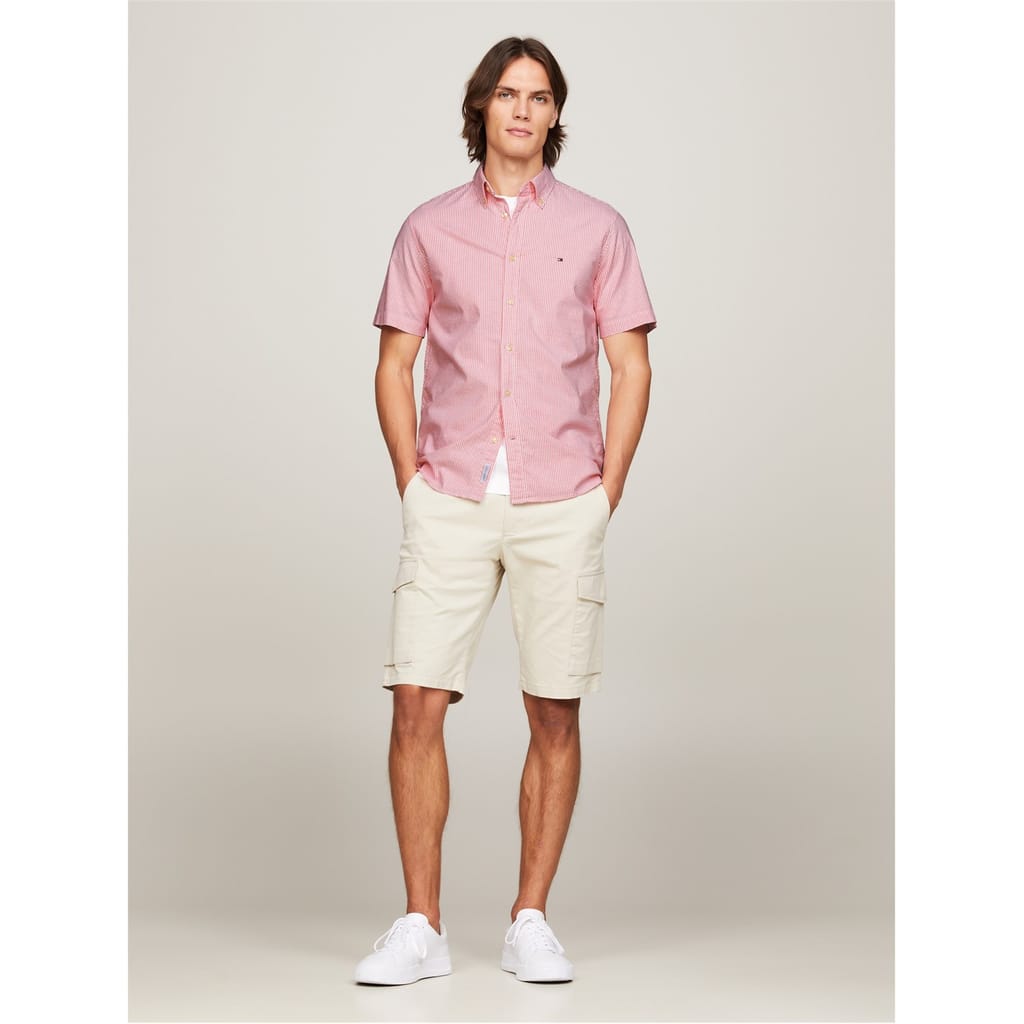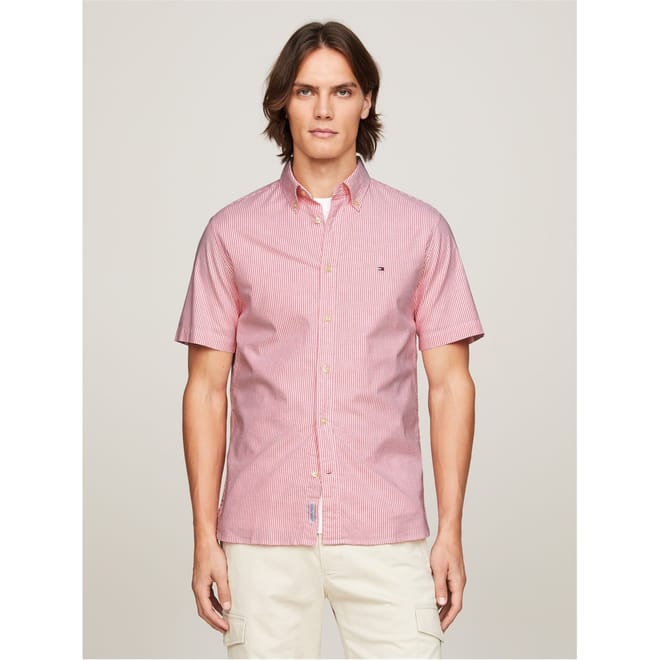 This Tommy Hilfiger dress shirt features a classic stripe pattern and short sleeves. It comes in a regular fit with a button-down closure. An elegantly understated logo embellishment adds a touch of refinement to this stylish piece. -