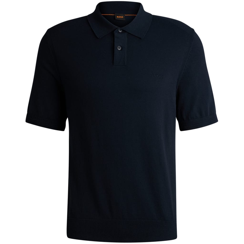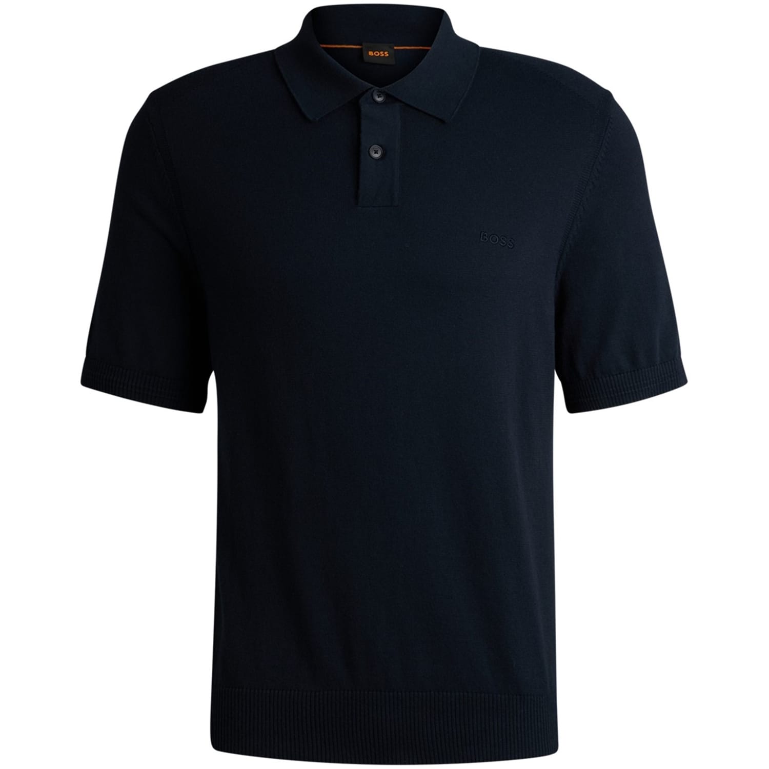 This BOSS polo shirt is a classic addition to your wardrobe. Crafted from knit fabric, it features a polo collar with a button closure and ribbed cuffs. The short sleeves and regular fit provide comfort and style. The solid pattern is elegantly accented with a subtle logo embellishment, making it a versatile choice for any occasion. -