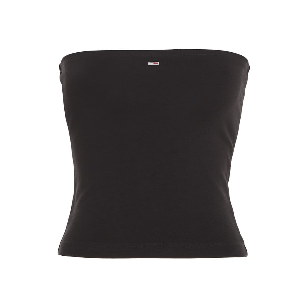 This Tommy Jeans tube top offers a chic, slim fit design. Adorned with a subtle logo, it features a solid pattern for a sleek, minimalist look. Perfect for a stylish and modern wardrobe. -
