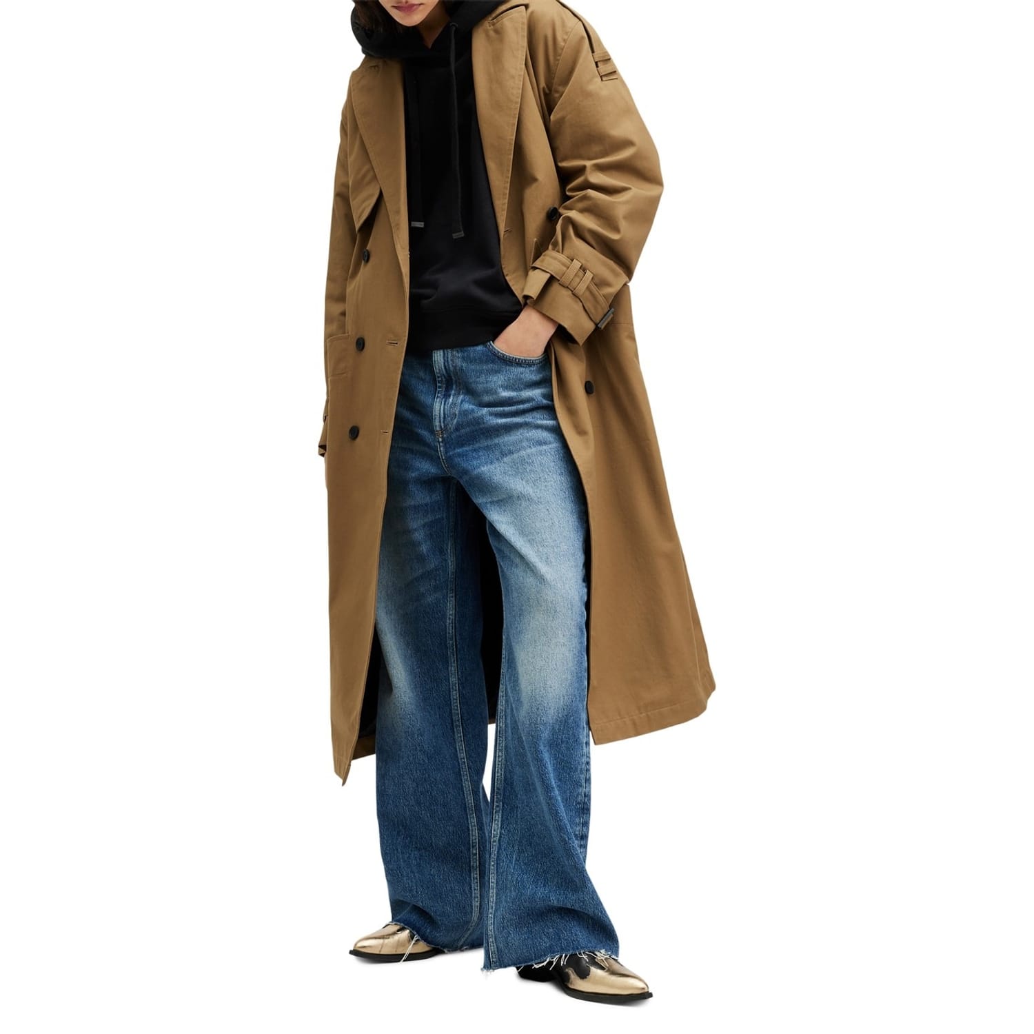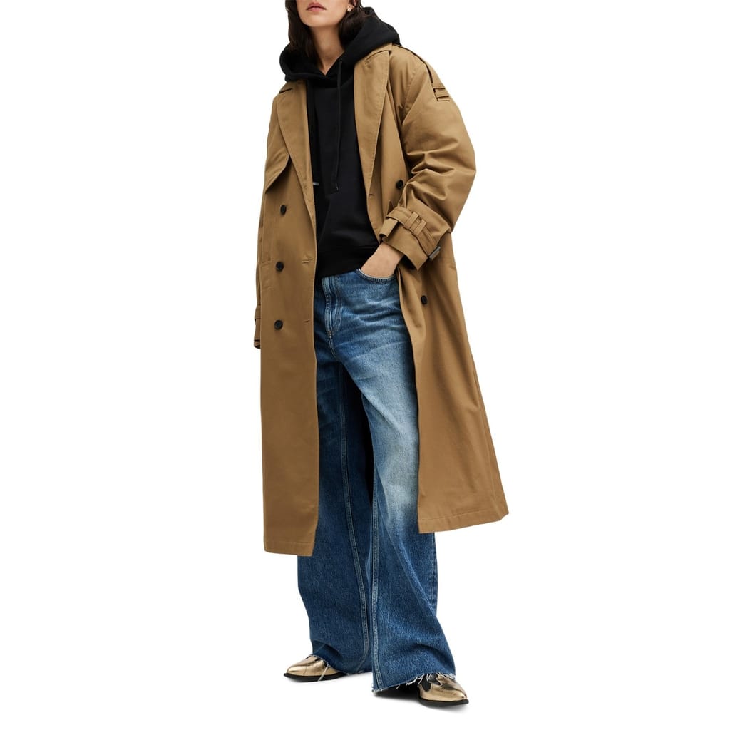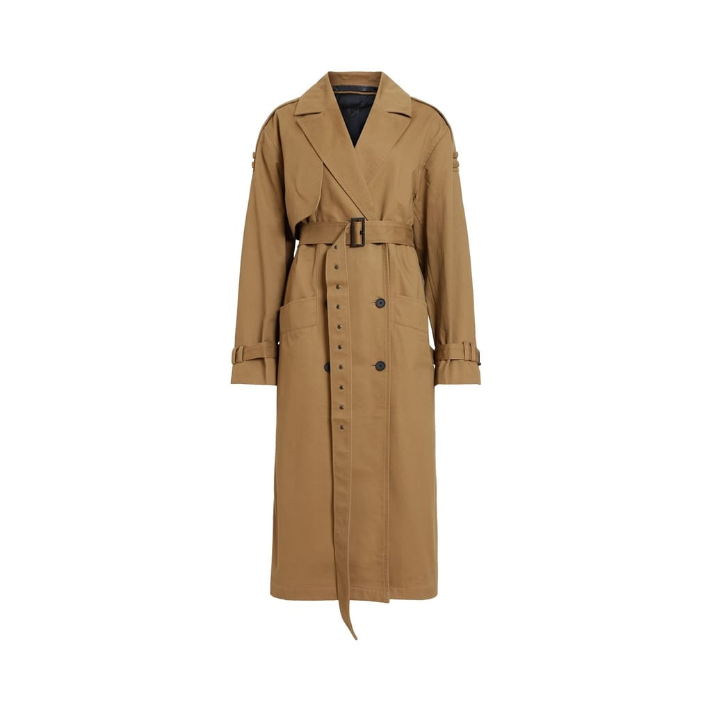 The Wyatt trench coat from AllSaints offers a sophisticated addition to your wardrobe. Designed with a collared neckline and a relaxed fit, it features a button closure and belt for added style. Detailed with pockets and cuff sleeves, this solid coat is perfect for versatile wear. -