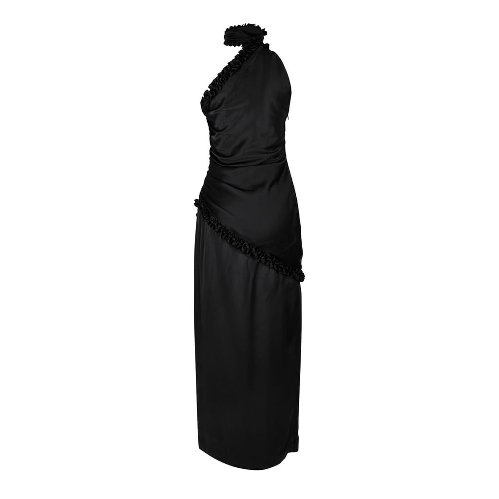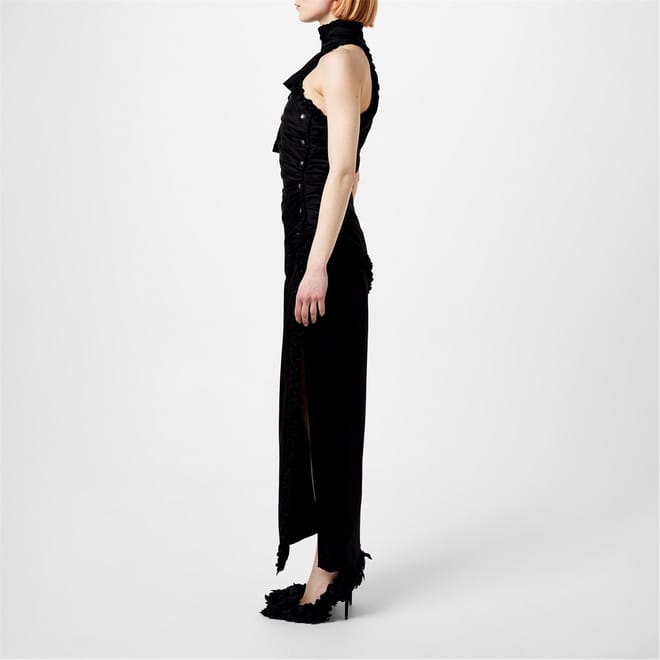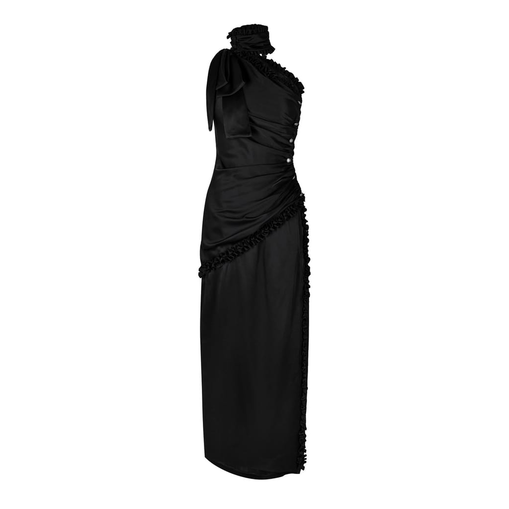 This Alessandra Rich maxi dress embodies elegance with its one-shoulder neckline and slim fit. The solid pattern enhances its sophisticated slip style, while the bow and ruffle embellishments add a touch of charm. Perfect for making a statement, this dress is a refined choice for any special occasion. -