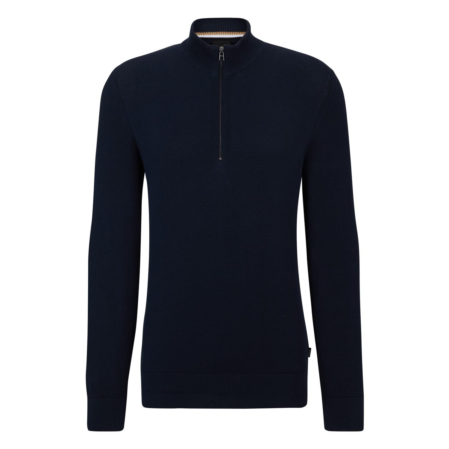 This Boss sweater is a stylish addition to your wardrobe. Featuring a mock neck and high collar, it combines comfort with a touch of sophistication. The cardigan style has long sleeves with ribbed cuffs, and a convenient half zipper closure adds a modern touch. Designed in a regular fit, this piece is perfect for layering during cooler weather. -