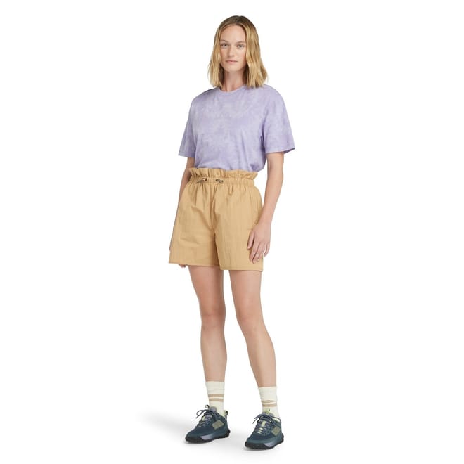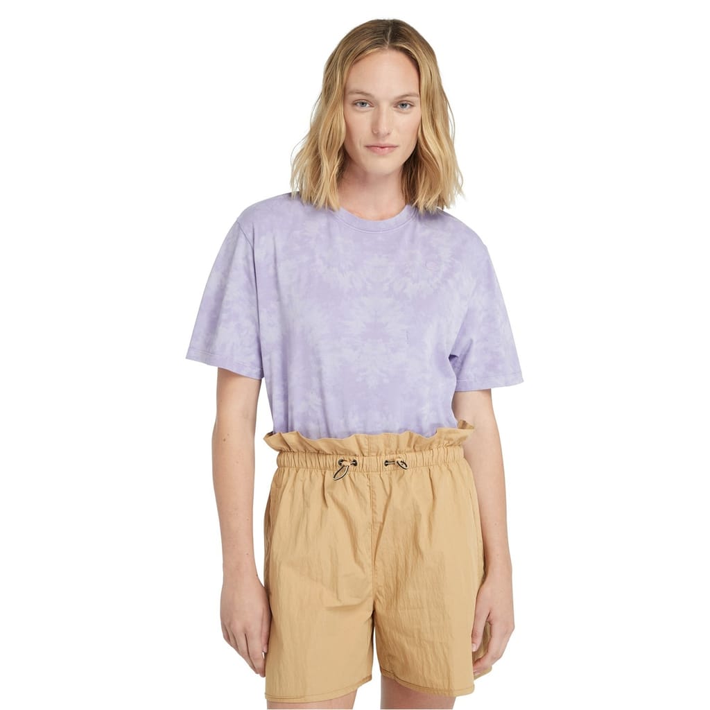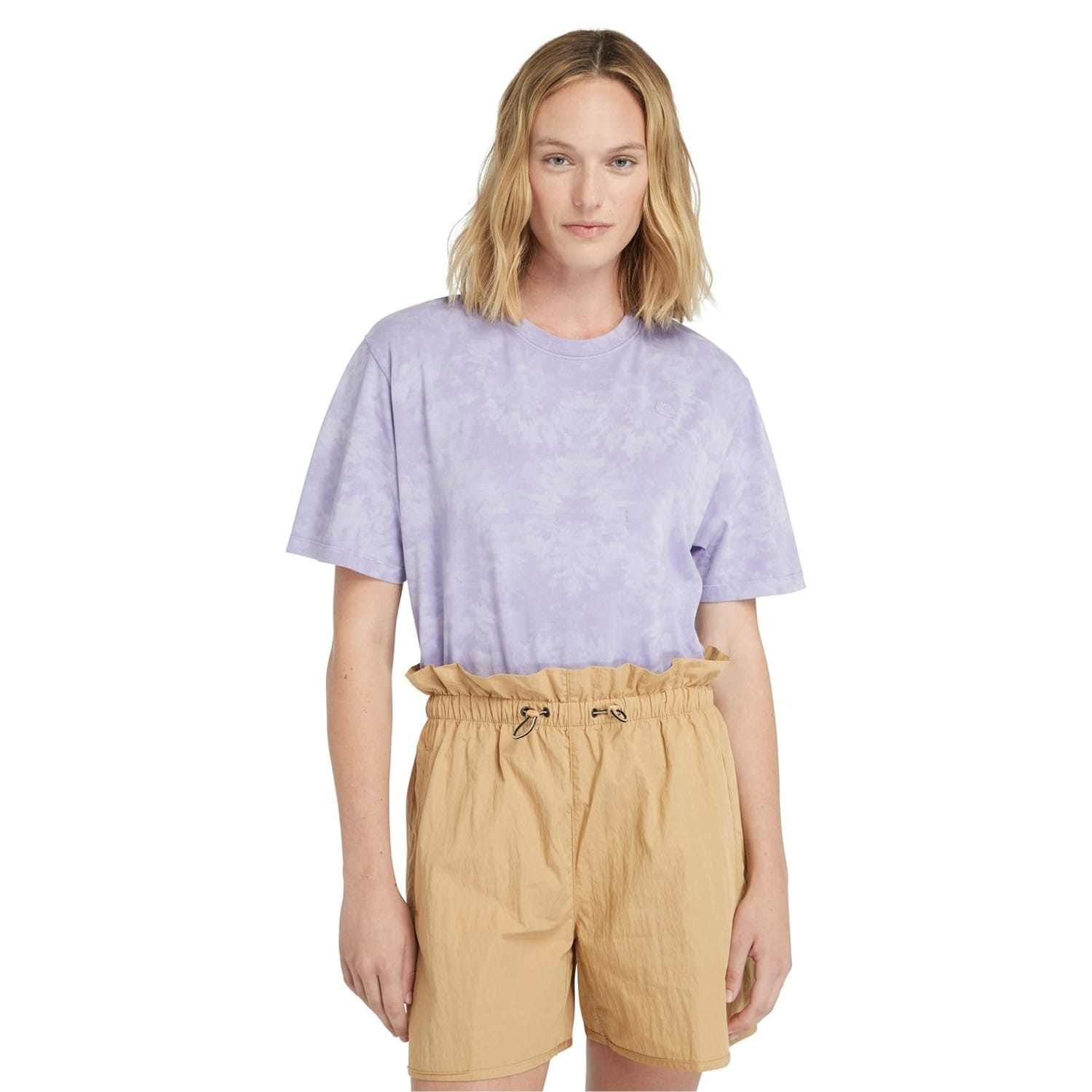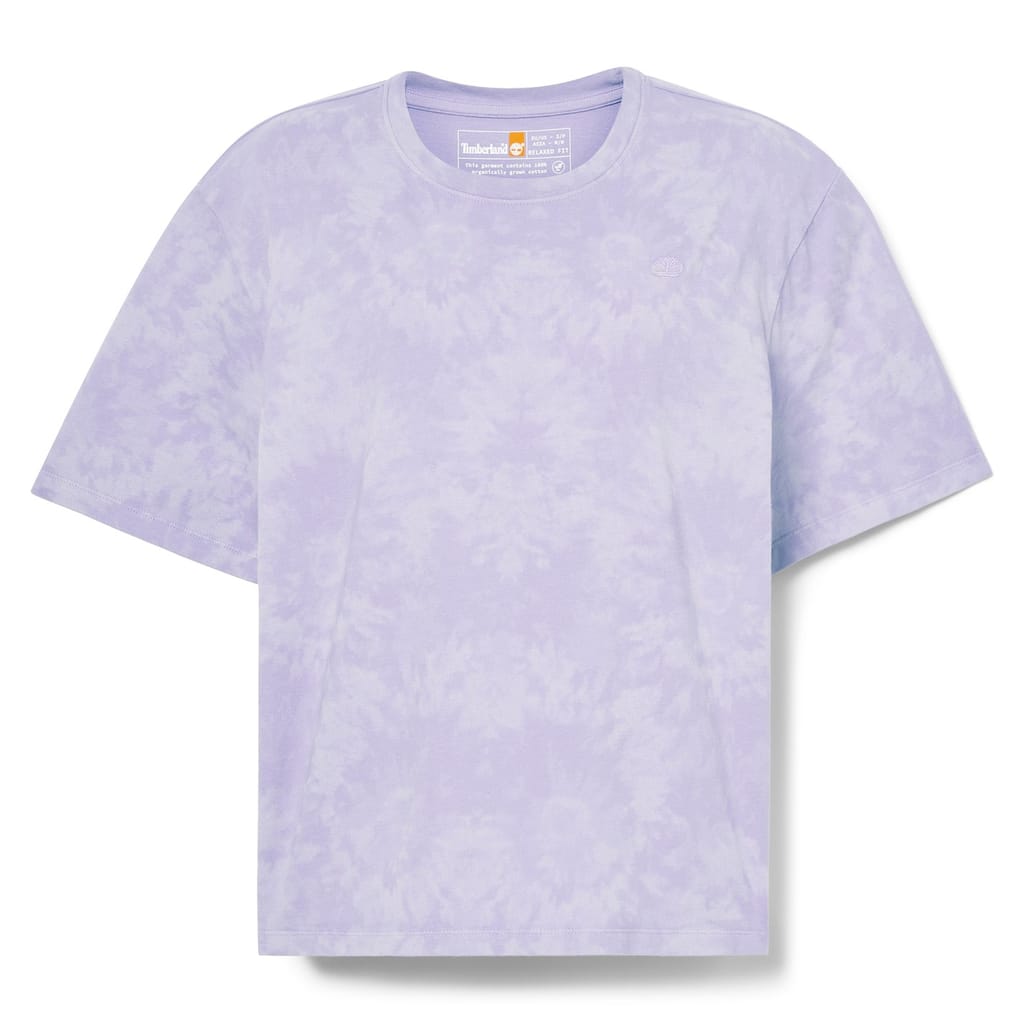 This Timberland tie-dye hoodie sweatshirt is a relaxed fit casual top featuring a hood and short sleeves. It showcases a distinctive logo for added style. -