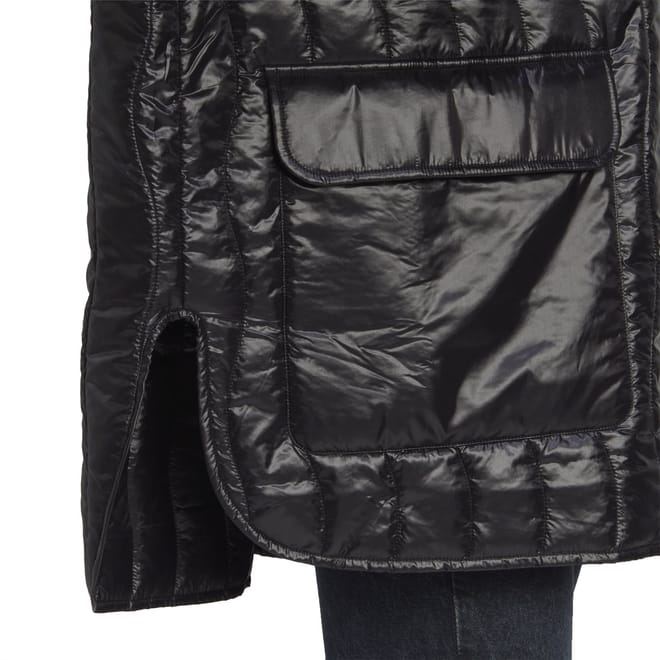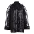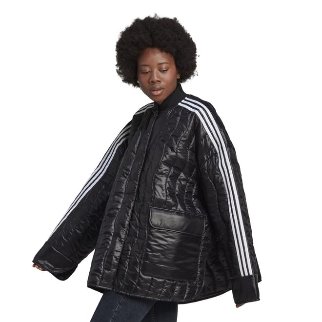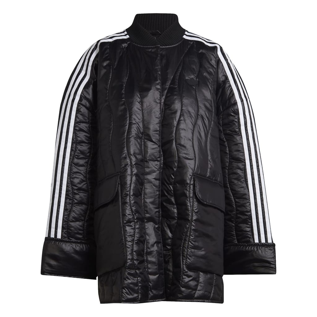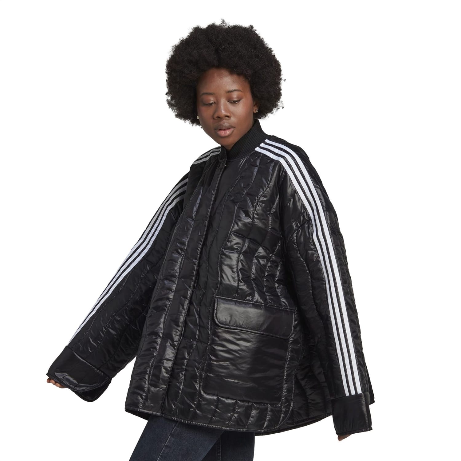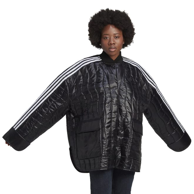 Stay stylish with the adidas Originals quilted bomber jacket from the outerwear collection. This long, oversize fit jacket features a crew neck, curved hem, and a solid pattern. Embellished with a logo and pockets, it combines snap button and zipper closures for convenience and style. -