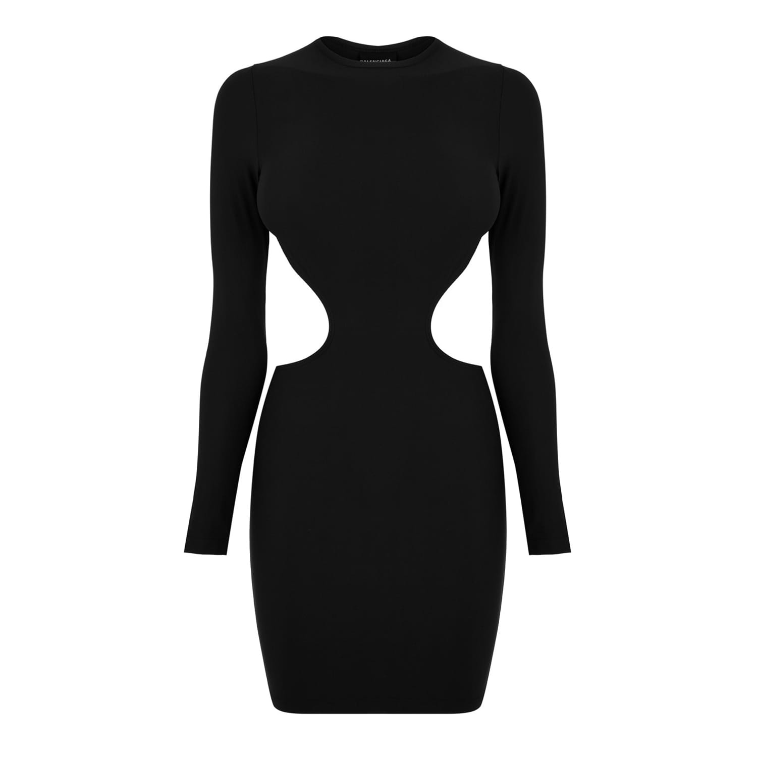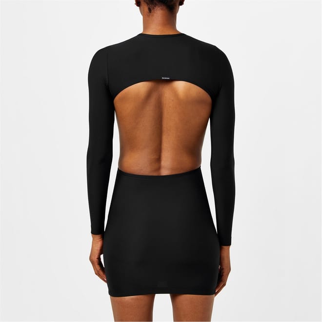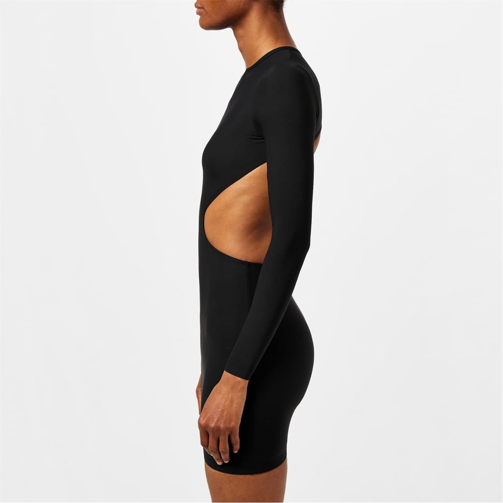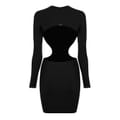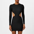 - Crafted from a Polyamide fabric, this mini dress is perfect for those seeking a statement piece with a minimal aesthetic. Presented in a sleek block colourway, whether it's a sophisticated cocktail party or an upscale event, this little black dress is perfect for versatile styling no matter the occasion. Defined with distinctive cut-out details elegantly framing the hips and back, this touch of allure and intrigue adds visual interest to the mini dress. Alongside a round neck and long sleeves for a balanced silhouette, the straight hem completes the look with a polished finish.