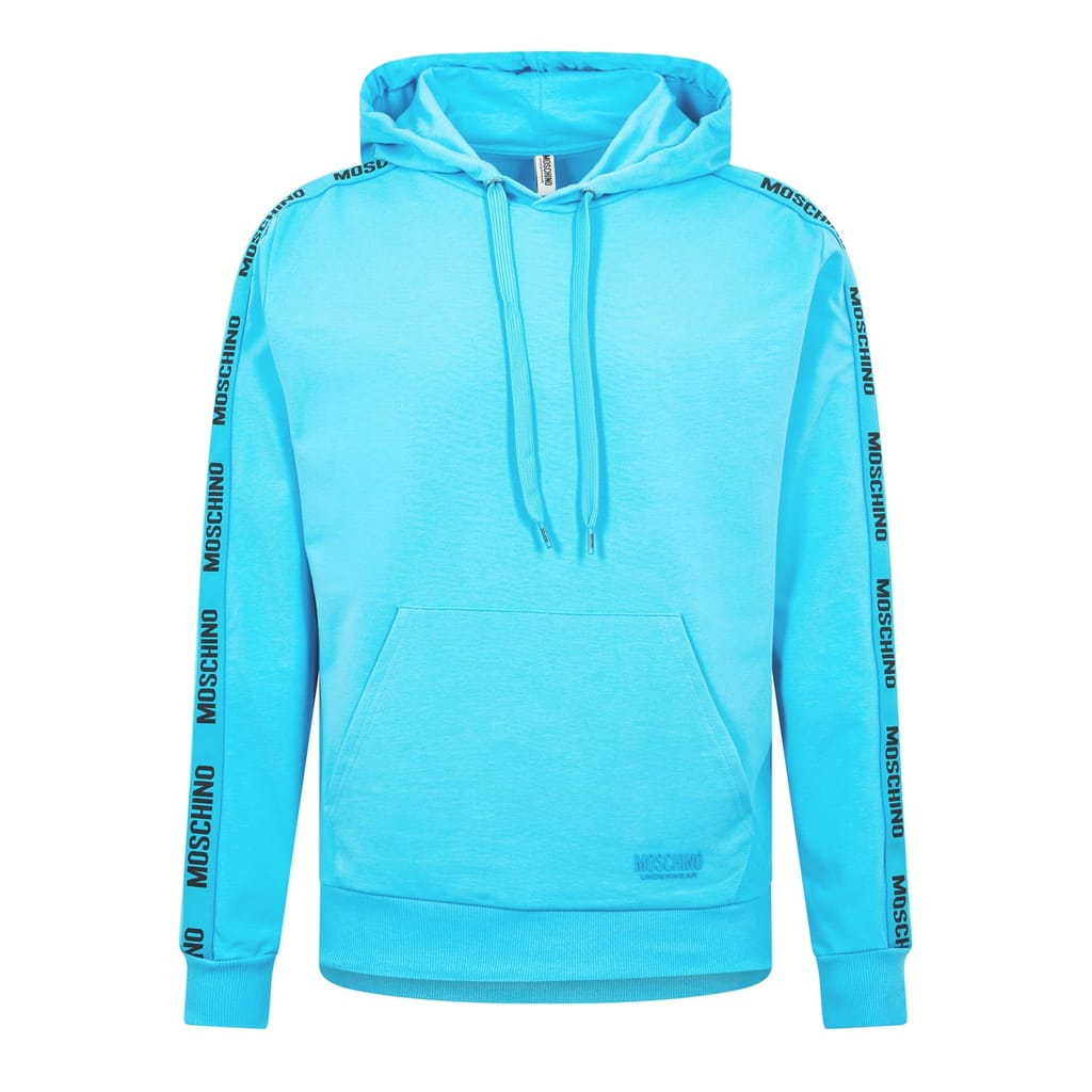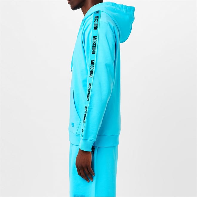 This Moschino sweatshirt, styled as a hoodie, features a hooded neckline and a drawstring closure. Made for a regular fit, it includes long sleeves with ribbed cuffs. The design is enhanced with a logo, tape detail, and a practical kangaroo pocket, providing a blend of style and functionality. -