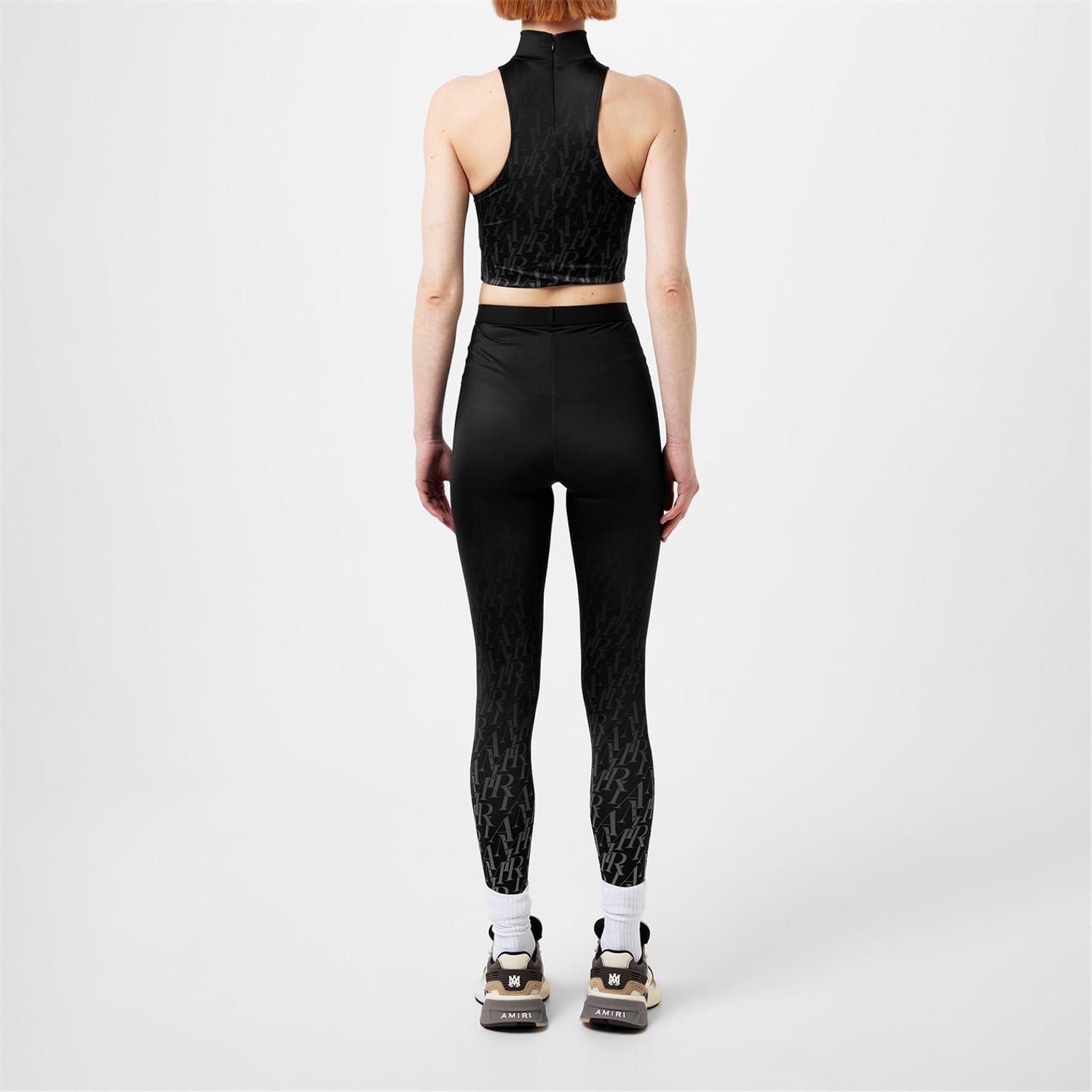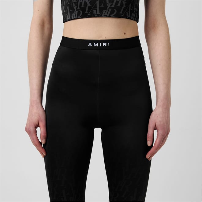 These Amiri leggings feature an all-over logo pattern, offering a stylish and contemporary look. The sleek design and prominent branding make them a standout choice for fashion-forward individuals. Perfect for adding a touch of sophistication to any wardrobe. -