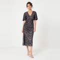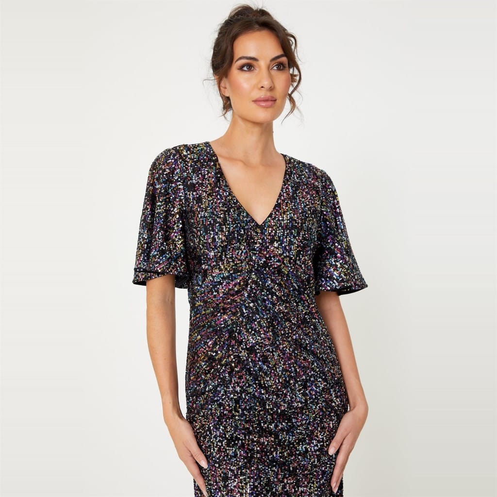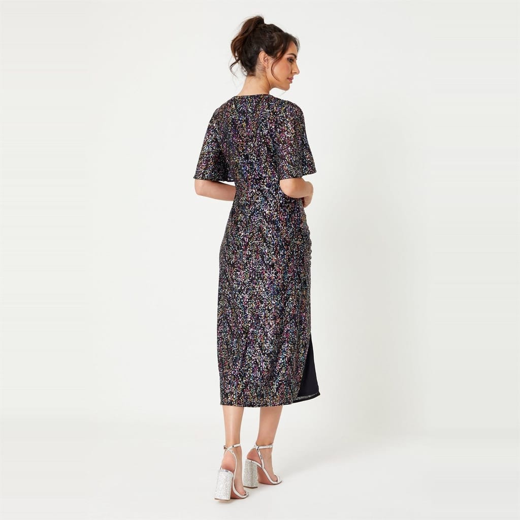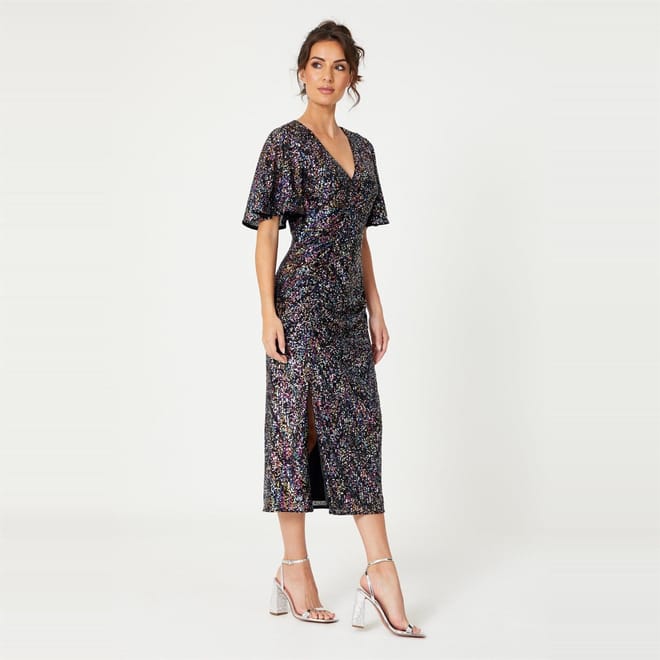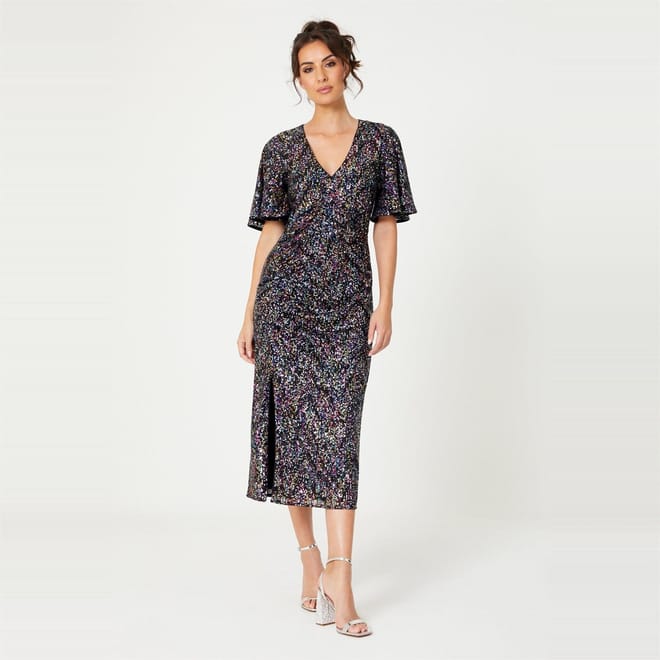 Elevate your wardrobe with Be You stunning midi dress. This solid-coloured piece features a v-neck and short flutter sleeves, adorned with elegant sequins. Designed in a slim fit, it offers a flattering silhouette. The straight hemline ensures a polished finish. Perfect for any occasion, this dress combines style and sophistication effortlessly. -