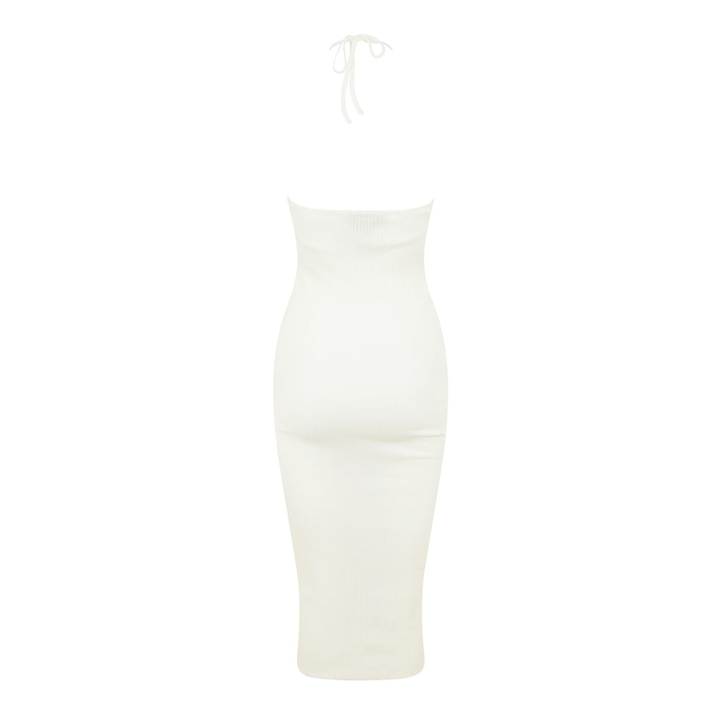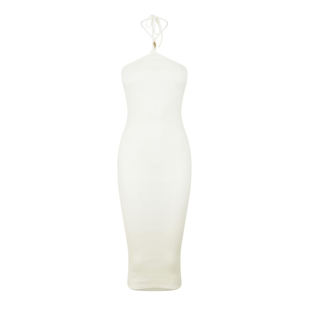 Discover the Amiri midi dress, a perfect blend of elegance and style. This slip dress features a halter neckline and a ribbed pattern, offering a sophisticated look. The slim fit design enhances your silhouette, while the tie closure adds a touch of detail. Ideal for those seeking a chic and modern wardrobe addition. -