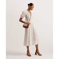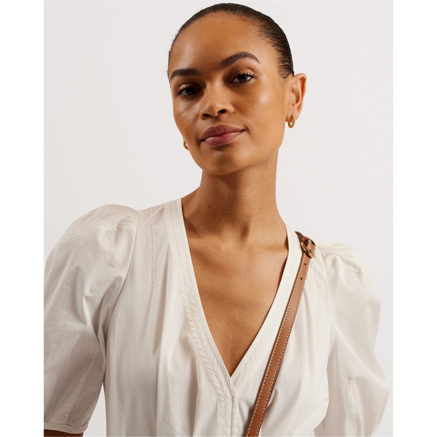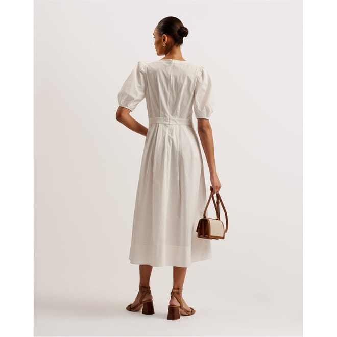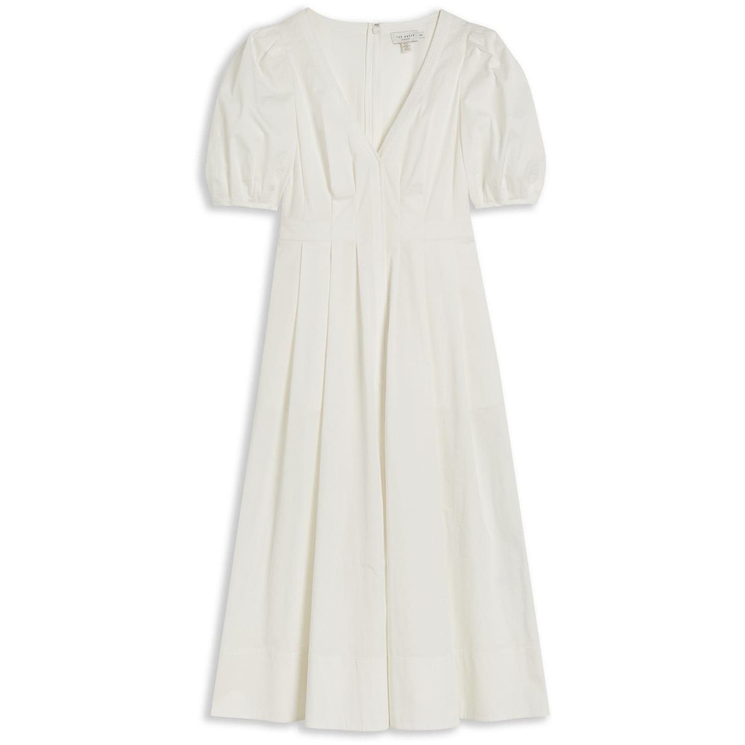 This Ted Baker midi dress features a flattering A-line style with a V-neck and puff sleeves. The solid pattern and straight hem add a touch of elegance, while the regular fit ensures comfort. Perfect for various occasions, this dress seamlessly blends style and sophistication. -