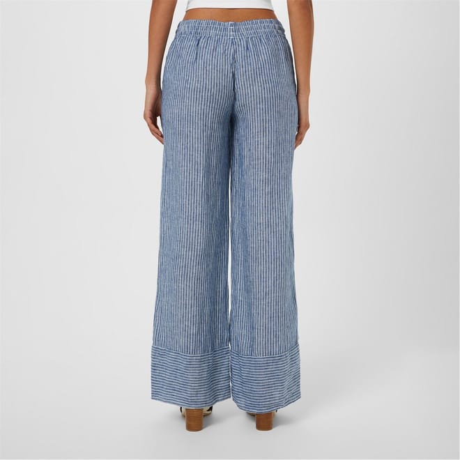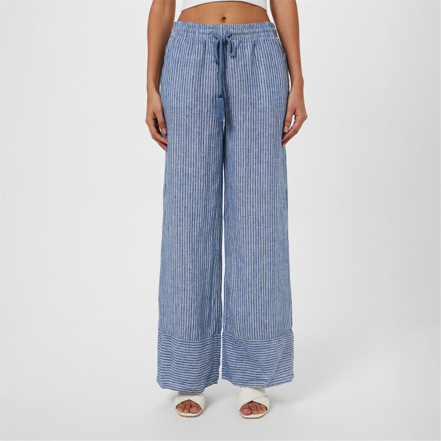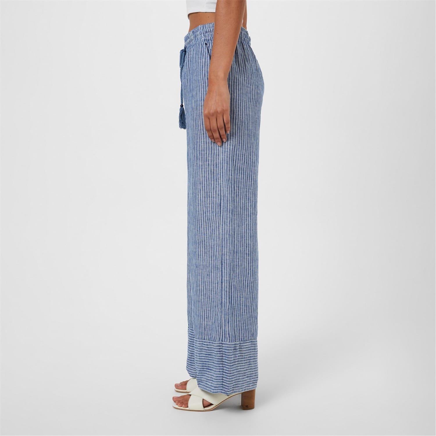 - These trousers are a sublime fusion of comfort and sophistication, crafted from a luxurious polyamide blend for a sumptuously soft feel against the skin. Designed with a high-rise silhouette and a drawstring waist, these trousers effortlessly blend comfort and style. The twisted tassels with bead detailing add a touch of whimsy, while the wide leg and relaxed fit create a flattering and effortlessly chic look alongside the pinstripe design. Whether you're attending a casual brunch or lounging at home, these trousers are perfect for any occasion. Practicality meets style with the two side slip pockets, allowing you to stylishly carry your essentials. The wide cuff detail adds a subtle hint of elegance, completing -