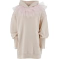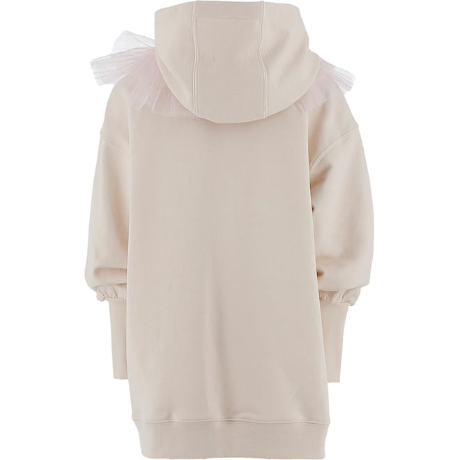This Philosophy di Lorenzo Serafini midi dress combines the casual comfort of a sweatshirt with elegant design elements. Featuring a hooded neckline and long sleeves, it is crafted in a solid pattern with a straight hem. The dress is adorned with ruffle embellishments, adding a touch of sophistication to its overall look. -