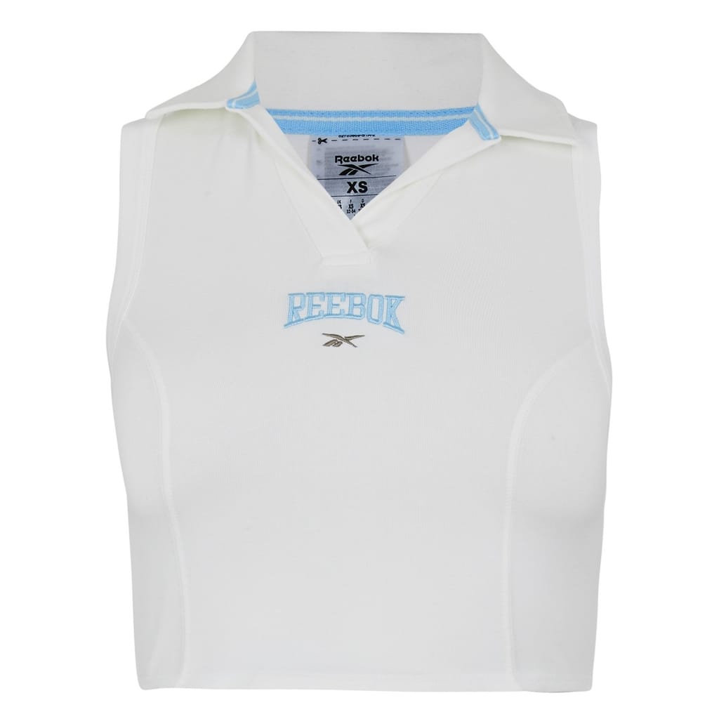 Reebok varsity tank top features a sleeveless design and a polo collar. Made in a solid pattern, this cropped top offers a regular fit. Embellished with a logo, it provides a stylish yet understated look. -