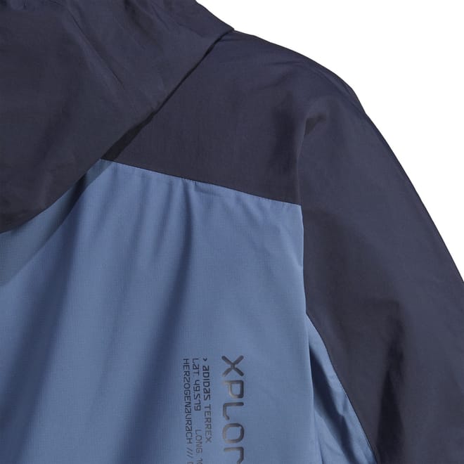 Introducing the adidas Xploric windbreaker jacket, perfect for sporting activities. This lightweight, water-repellent jacket features a relaxed fit with a hooded neckline and a zipper closure. The color block design is complemented by functional embellishments including a logo, chest pocket, and front zipper pockets. -