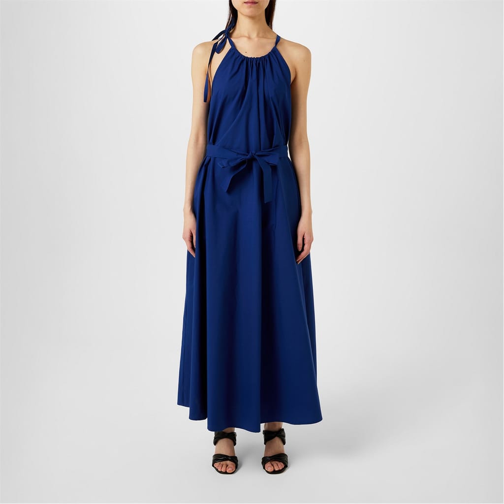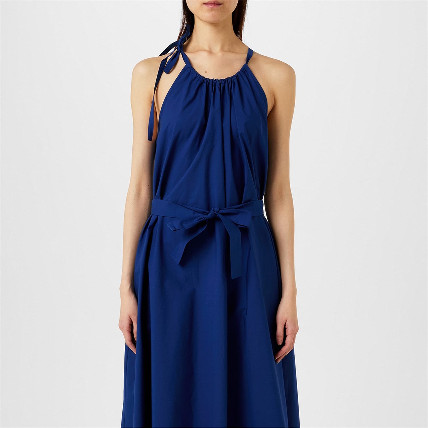 This elegant maxi dress from Max Mara Weekend features a halter neckline and a timeless A-line silhouette. The solid pattern ensures versatility, while the smocked embellishments and bow add a unique touch. Perfect for various occasions, this dress combines classic style with refined details. -