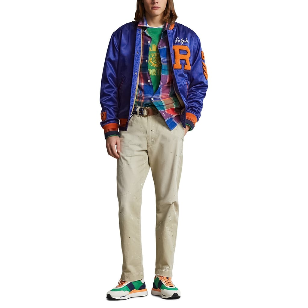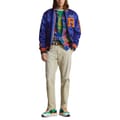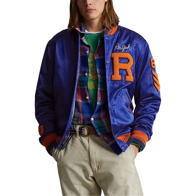 Embrace a classic look with this Polo Ralph Lauren baseball jacket. Crafted in a solid pattern, it features a ribbed collar and ribbed cuffs for added style. The snap button closure ensures a secure fit, while the regular fit provides comfort. Embellished with a logo, lettering, and embroidered patch pocket, this jacket combines tradition with modern elements. -