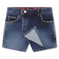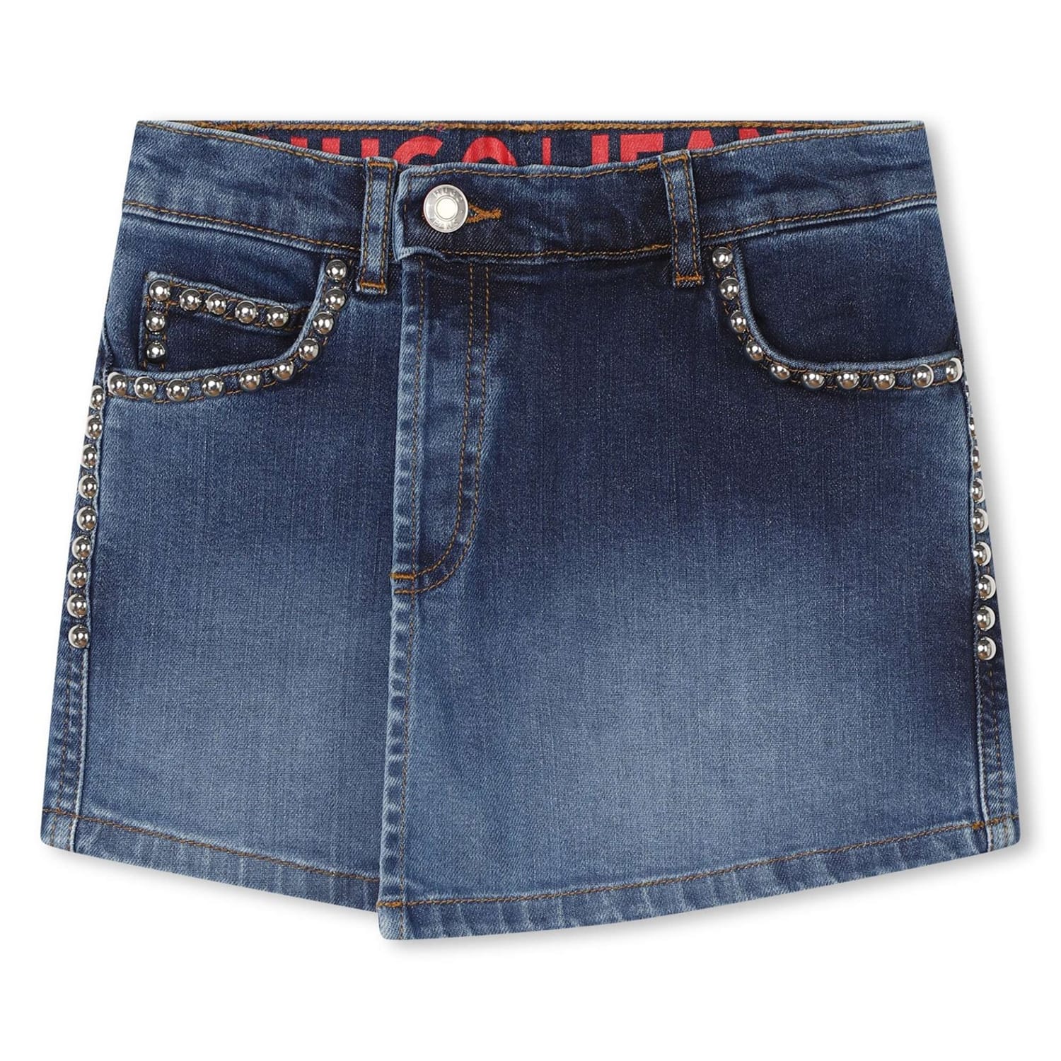 Let your young one experience radiating sophistication and timeless elegance with Hugo's Denim Skort. Meticulously crafted from a premium cotton blend, this 2-in-1 design effortlessly marries the allure of a skort with the versatility of a classic short. The regular fit and upper-thigh length style accentuates the silhouette, exuding a modern yet poised allure. Its front flap and button fastening reflect meticulous detailing, ensuring a seamless fusion of functionality with a touch of contemporary flair. Boasting five pockets for essential practicality, this mini-skort incorporates small silver-tone studs around the front pockets creating a touch of opulence.