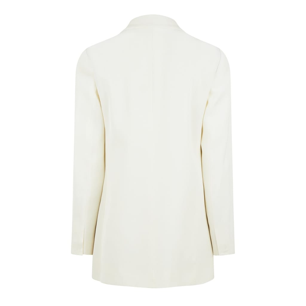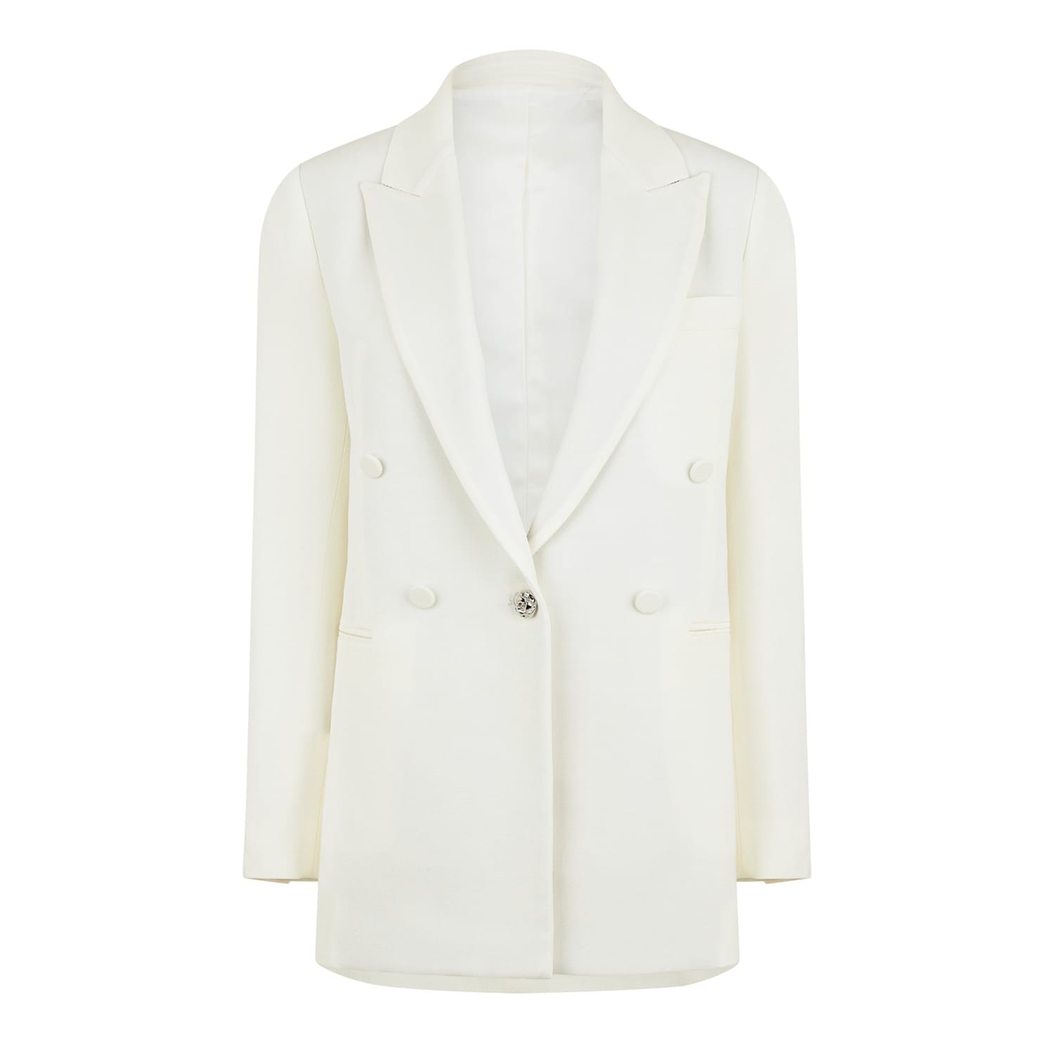 - Lined with precision, the jacket's straight-tailored fit accentuates the silhouette, while the structured power shoulders and notched lapels add a touch of sophistication. Edged with long sleeves boasting split cuffs, every detail exudes meticulous craftsmanship. The double-breasted design, fastened with a single front bow button, exudes grace and poise. Practicality meets style with two side welt pockets, with discreet interior pockets for seamless functionality. Designed for formal occasions, this jacket is the epitome of refined grace and polished charm, showcasing your impeccable taste and sophisticated style effortlessly.