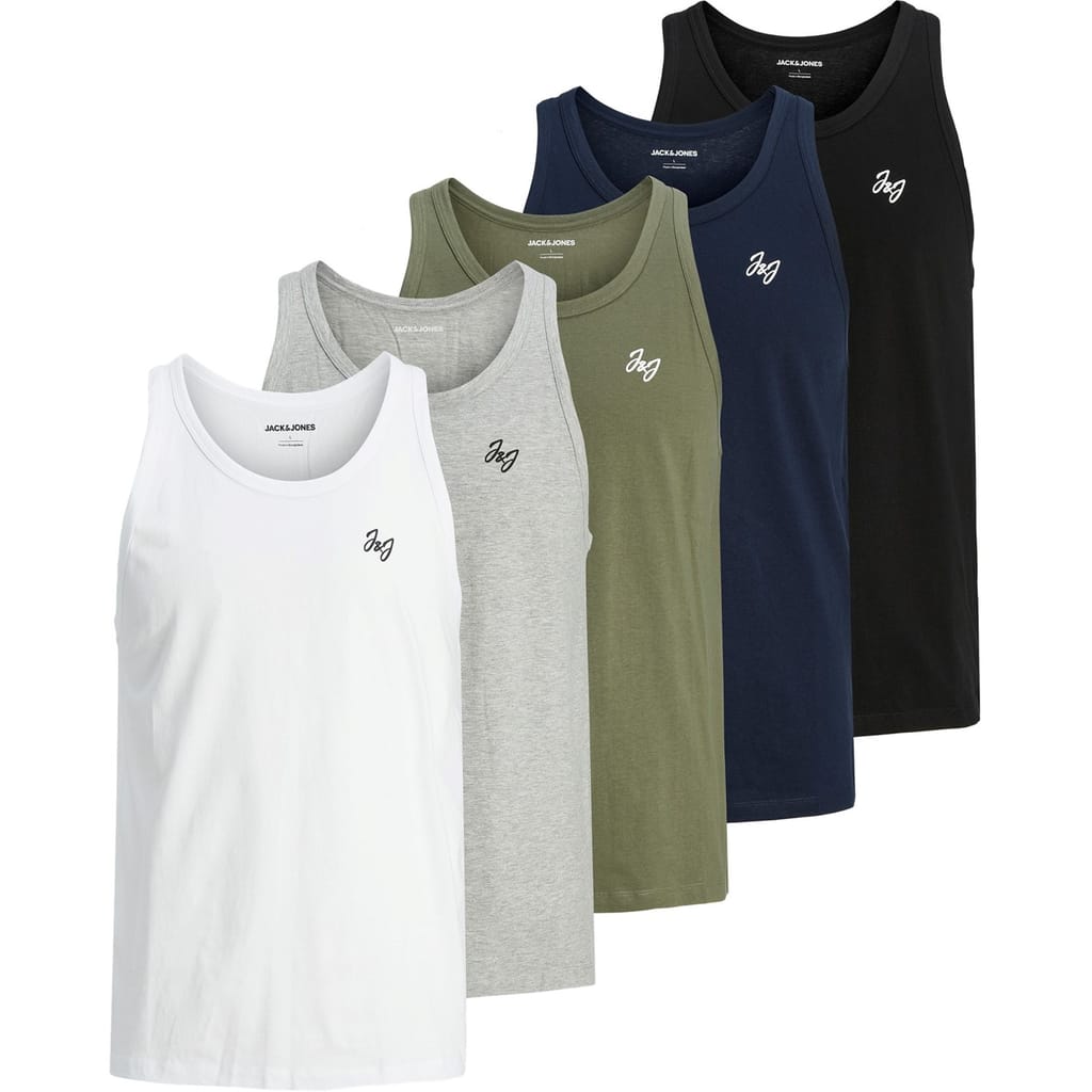 Upgrade your essentials with this 5-pack of Jack and Jones tank tops. These sleeveless vests feature a scoop neck and solid pattern, offering a regular fit for everyday comfort. Each piece is adorned with a logo, making them a stylish addition to your wardrobe. -