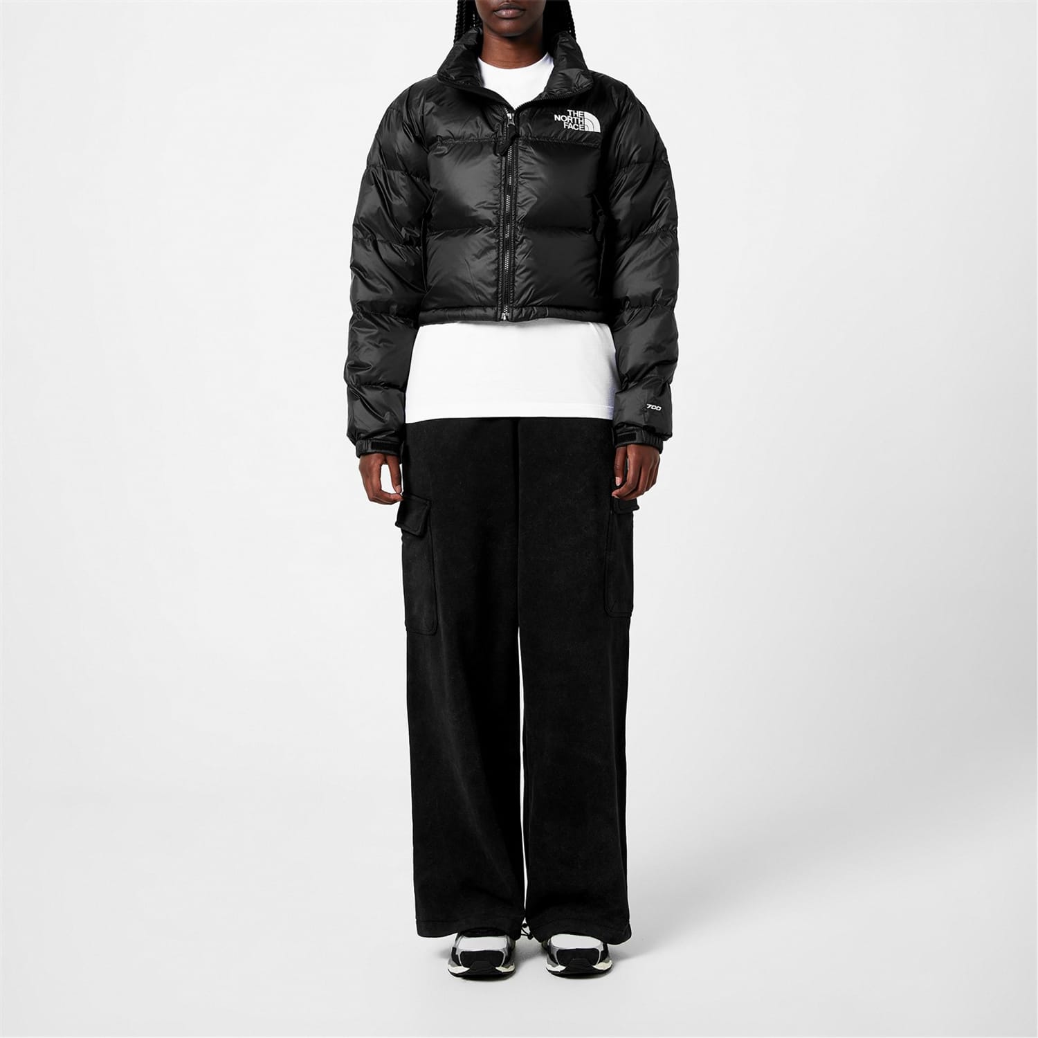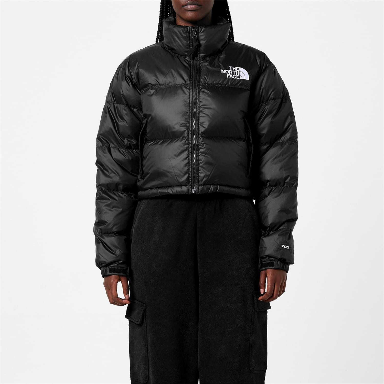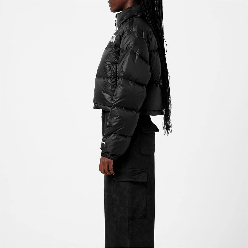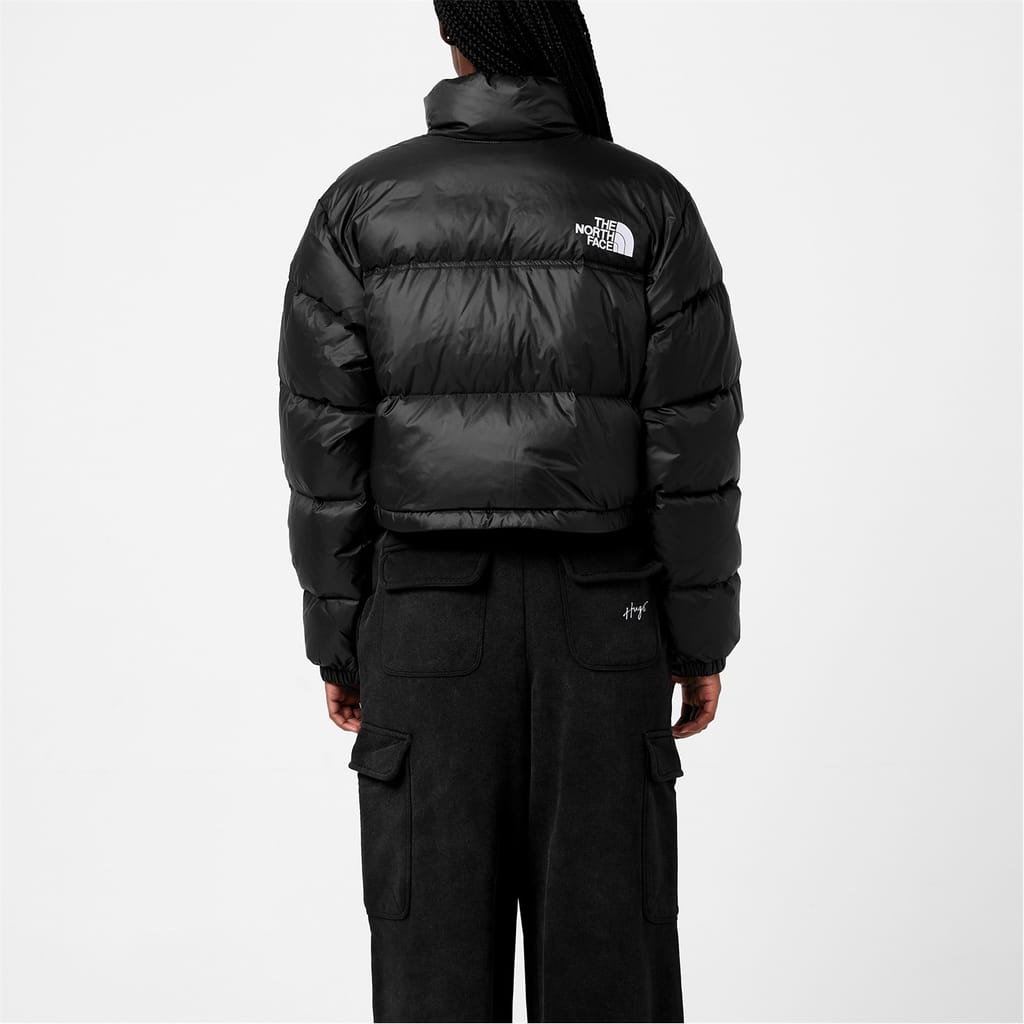 Elevate your outerwear and combat the winter in style with this stylish and practical Nupste Cropped Jacket from designers at the North Face Lux. Taking inspiration from the 1996 Nuptse Jacket, this jacket is expertly crafted in a 100% Nylon ripstop water repellent fabrication. Constructed in a relaxed fit, cropped box design, this jacket features a fashionable stand collar design with concealed and stowable three-piece hood. Fastened using a discrete tone on tone full frontal zip fastener, elasticated touch close cuffs and drawstring fastener at the hem allow for a more adaptable and comforting wear. An additional two zipped pockets allow space for your personal belongings, with the addition of the 700 fill goose down filling provides a comforting and insulated layer of warmth for the wearer that is practical for harsher environments. The look is finished in a solid black colourway with an oversized quilted baffle design. Completed with two large North Face logos reminiscent of th