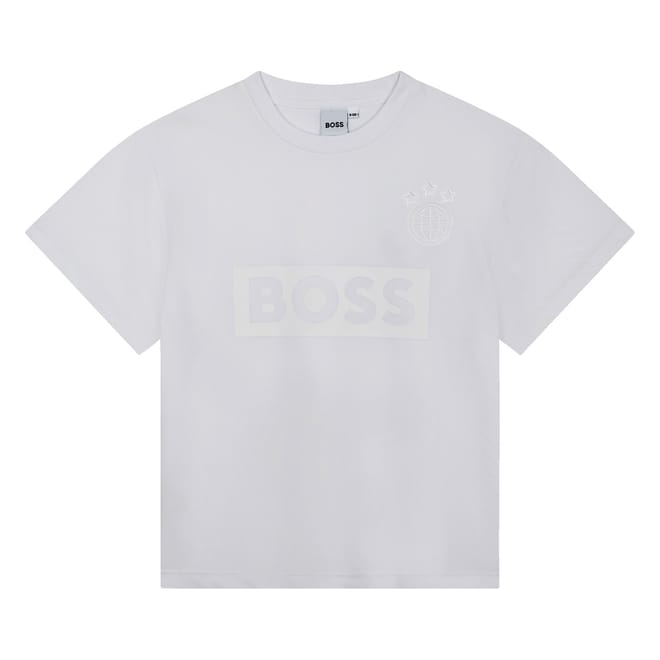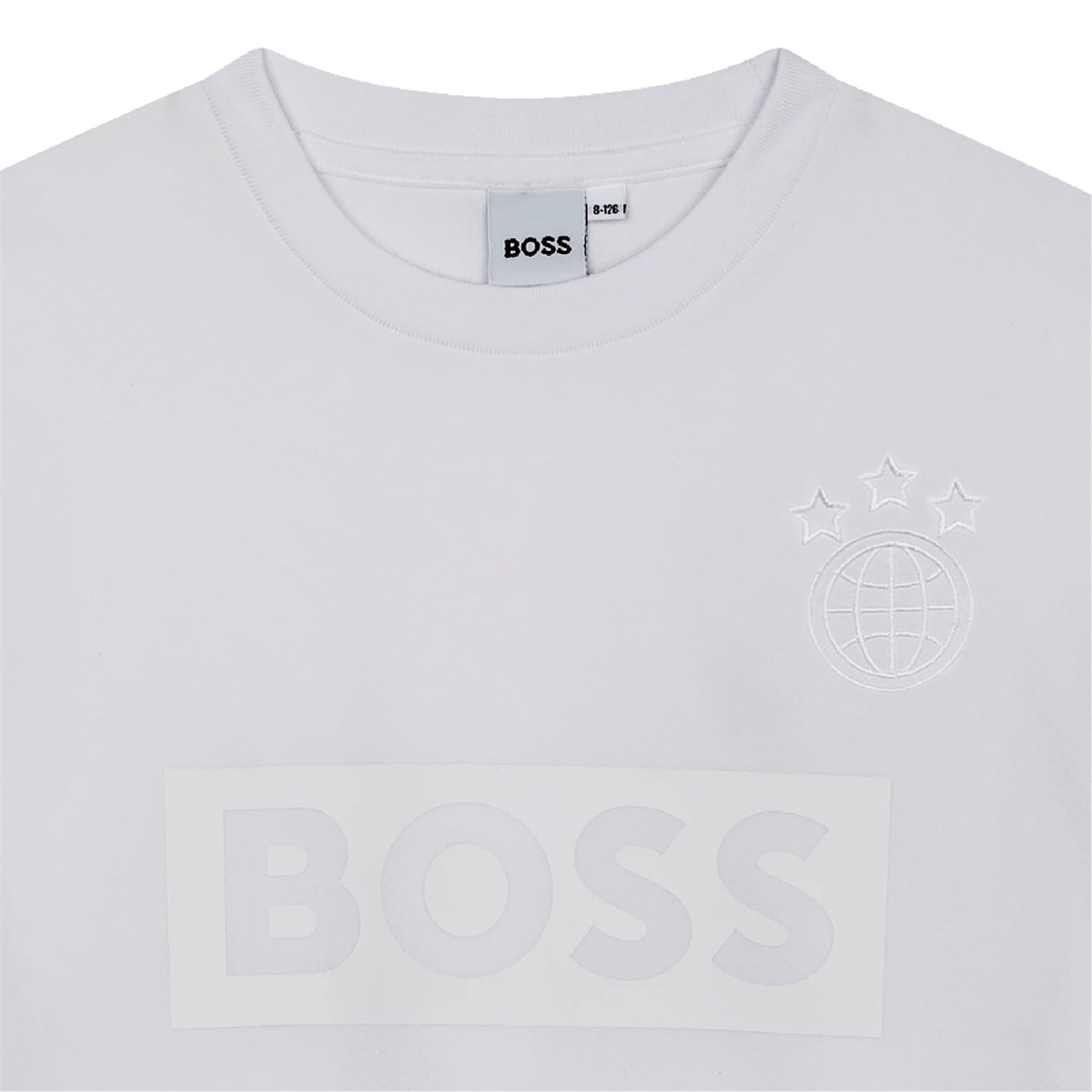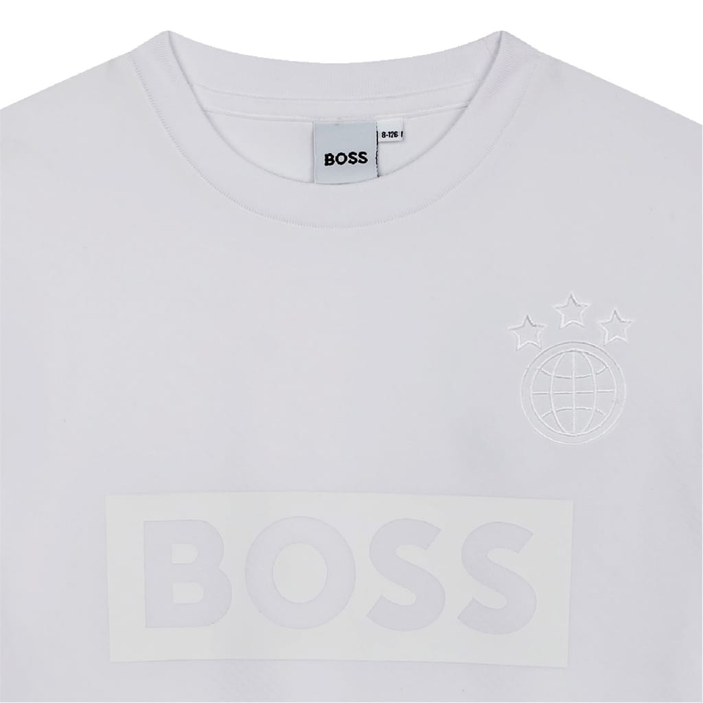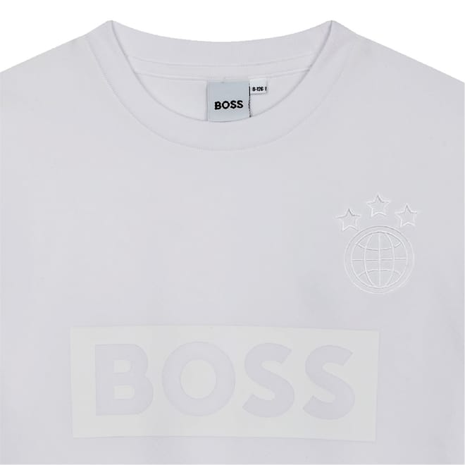 This Boss T-shirt features a classic crew neck and short sleeves, offering a regular fit for everyday comfort. The solid pattern is complemented by a distinctive globe graphic and the iconic logo embellishment, making it a versatile addition to any wardrobe. -