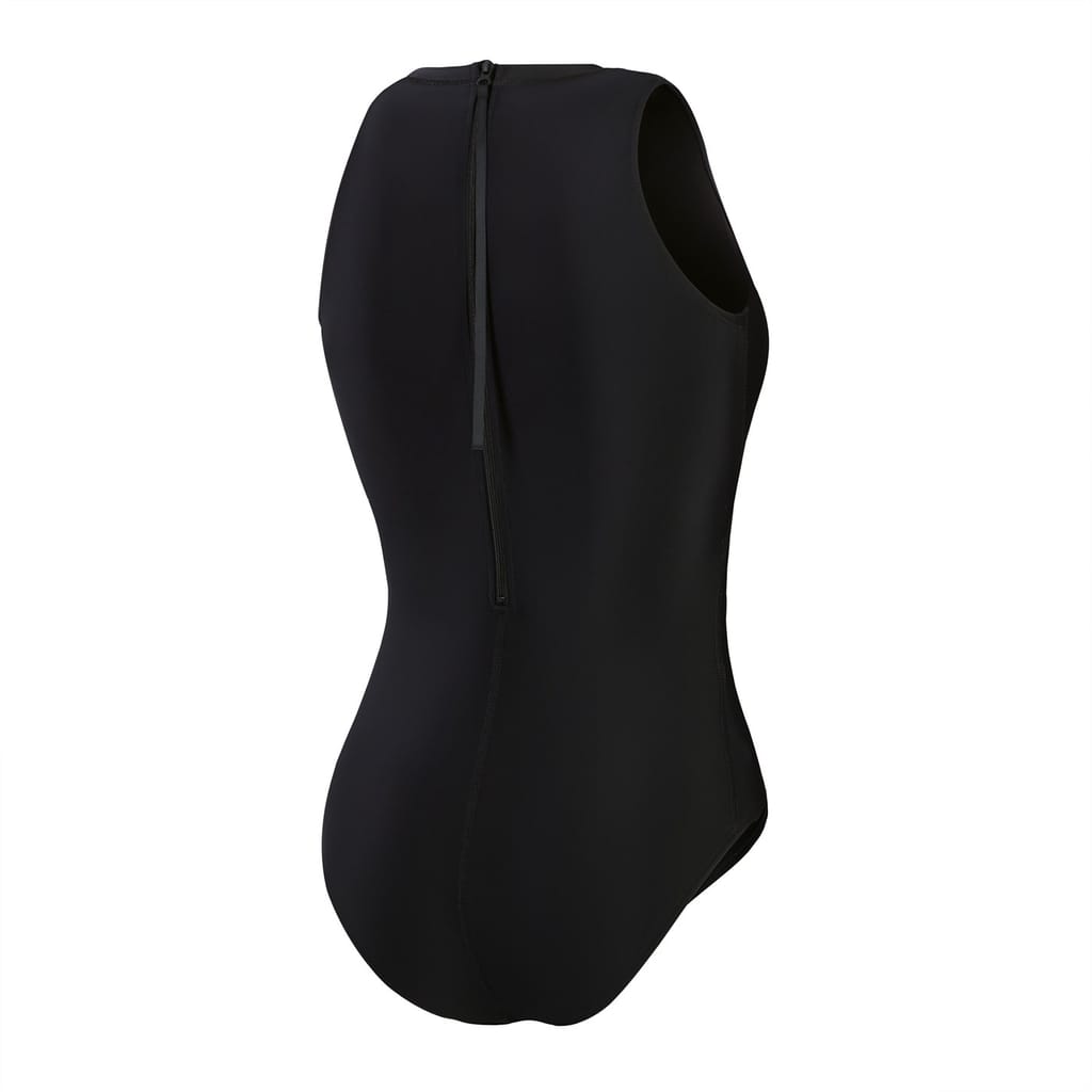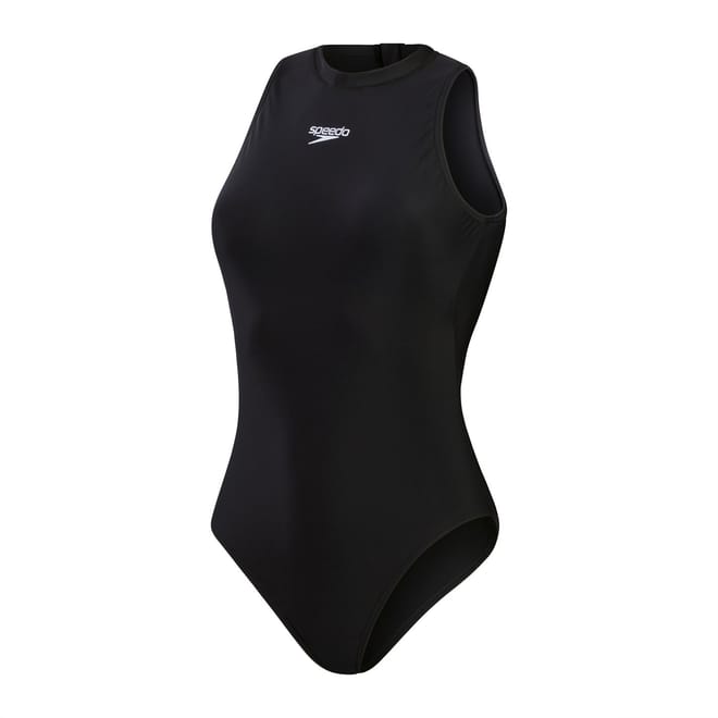 Dominate your lane with the Speedo Hydrasuit, where classic style meets unmatched functionality. Flex and flow become second nature, as Speedo's EnduraFlex fabric, with CREORA® HighClo™, offers superior shape retention and chlorine resistance, ensuring your suit fits like new, dive after dive. Plus, the mindful construction from 100% pre-consumer recycled nylon yarns means this swimsuit is not only soft and stylish but also sustainable. Featuring a high-cut leg design grants you the freedom for powerful kicks and turns, boosting your workout to maximum intensity. The iconic high neck and boldly updated zip-up back aren't just about full coverage but also aid in quick, hassle-free changes with an extended puller. Designed in a chic colourway, this Hydrasuit is punctuated by the central Speedo logo for an iconic finish. -