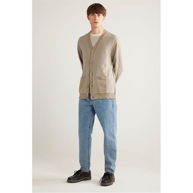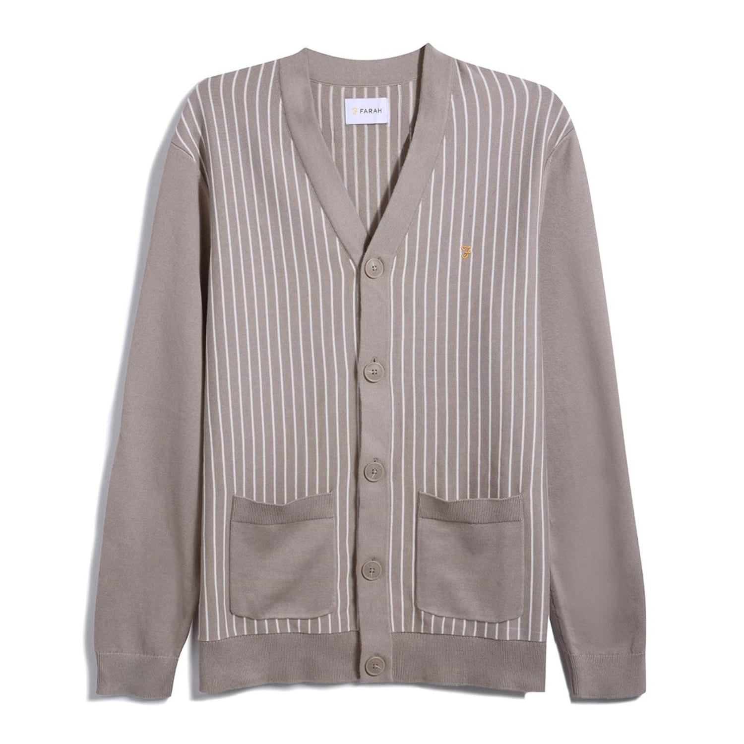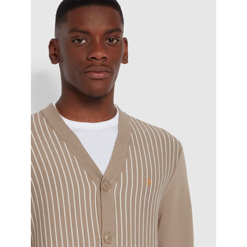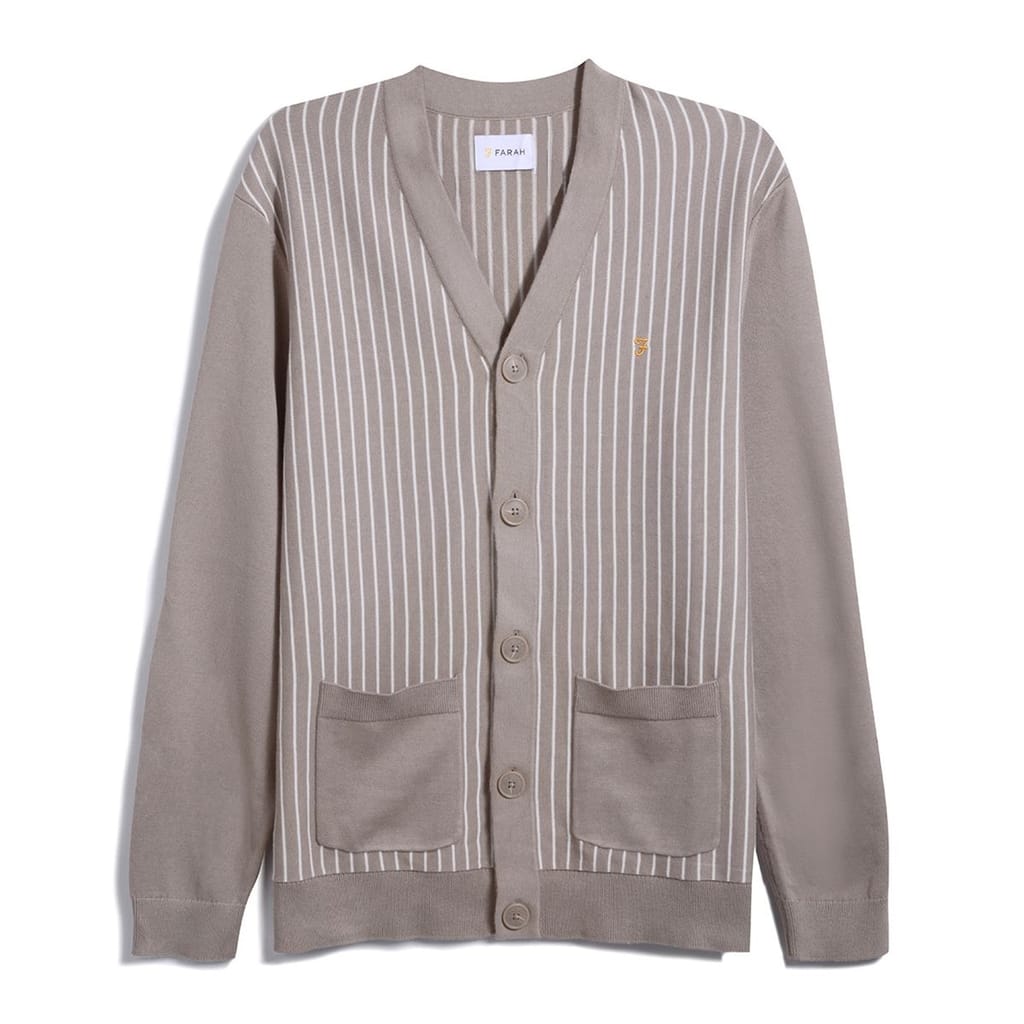 Stay warm and stylish in this Farah cardigan sweater. Featuring a striped pattern and crafted from a knit material, it's perfect for autumn and winter. The V-neck design and button closure enhance its classic appeal, while the long sleeves and ribbed cuffs add comfort. Embellished with a logo and pocket, it offers a regular fit ideal for everyday wear. -