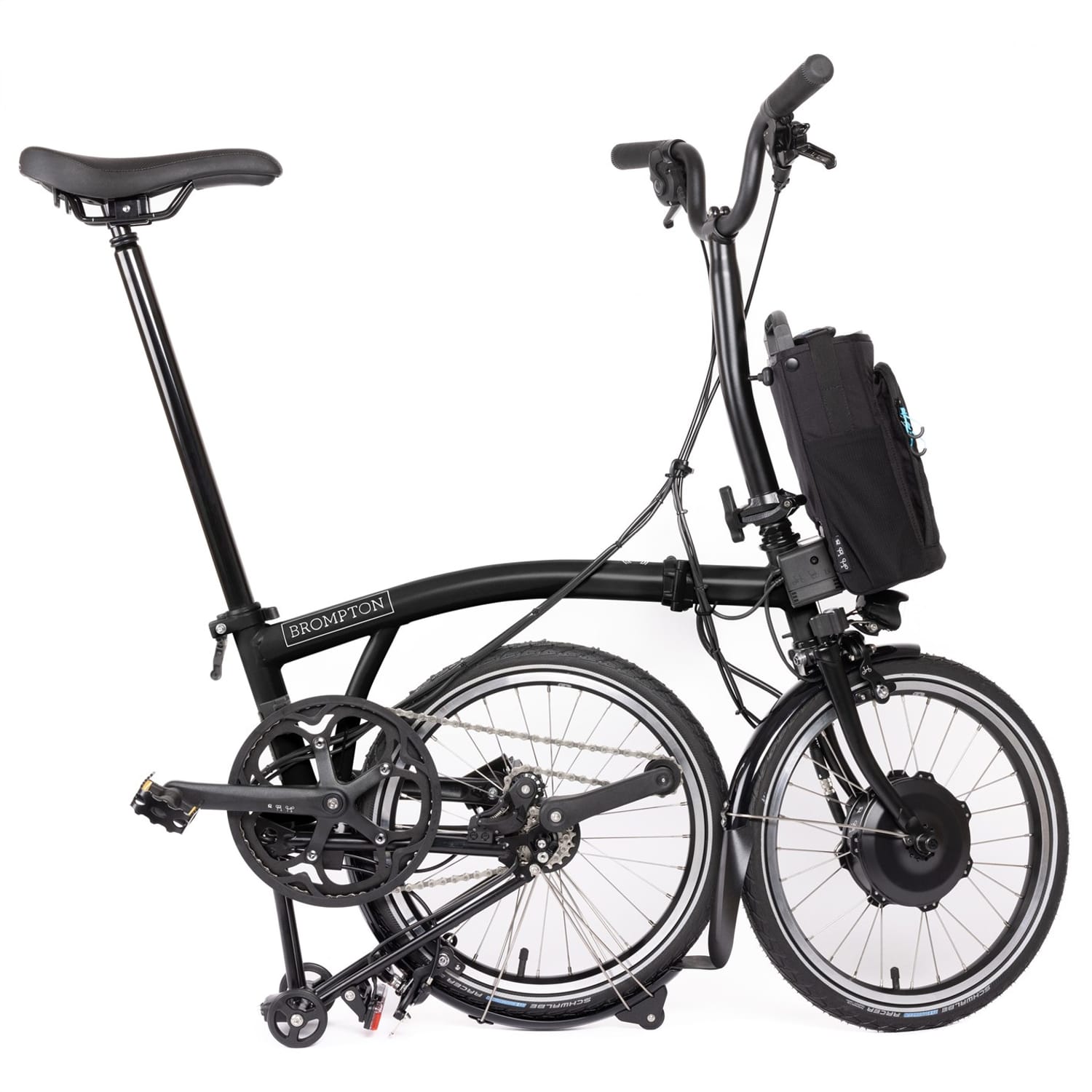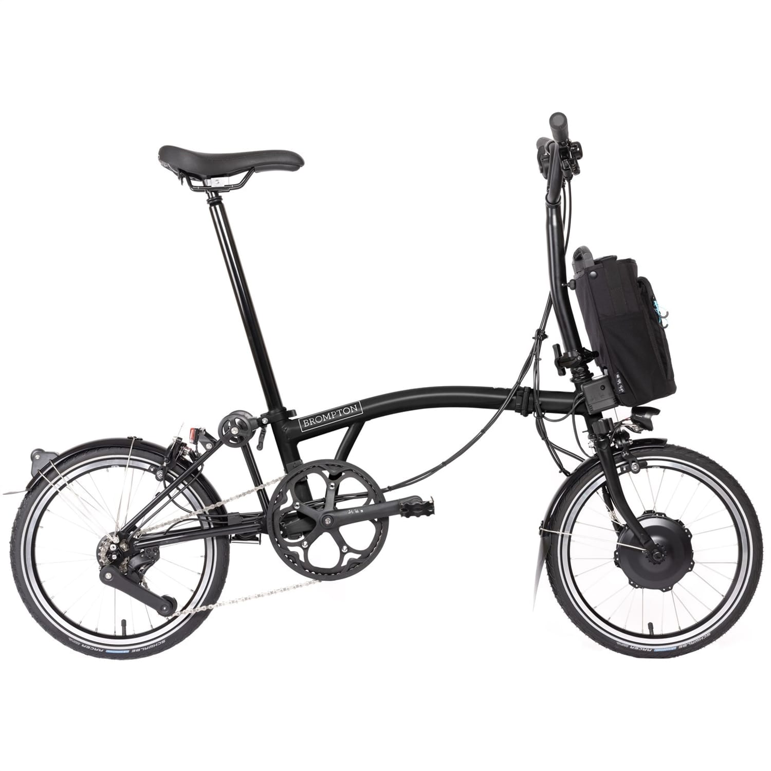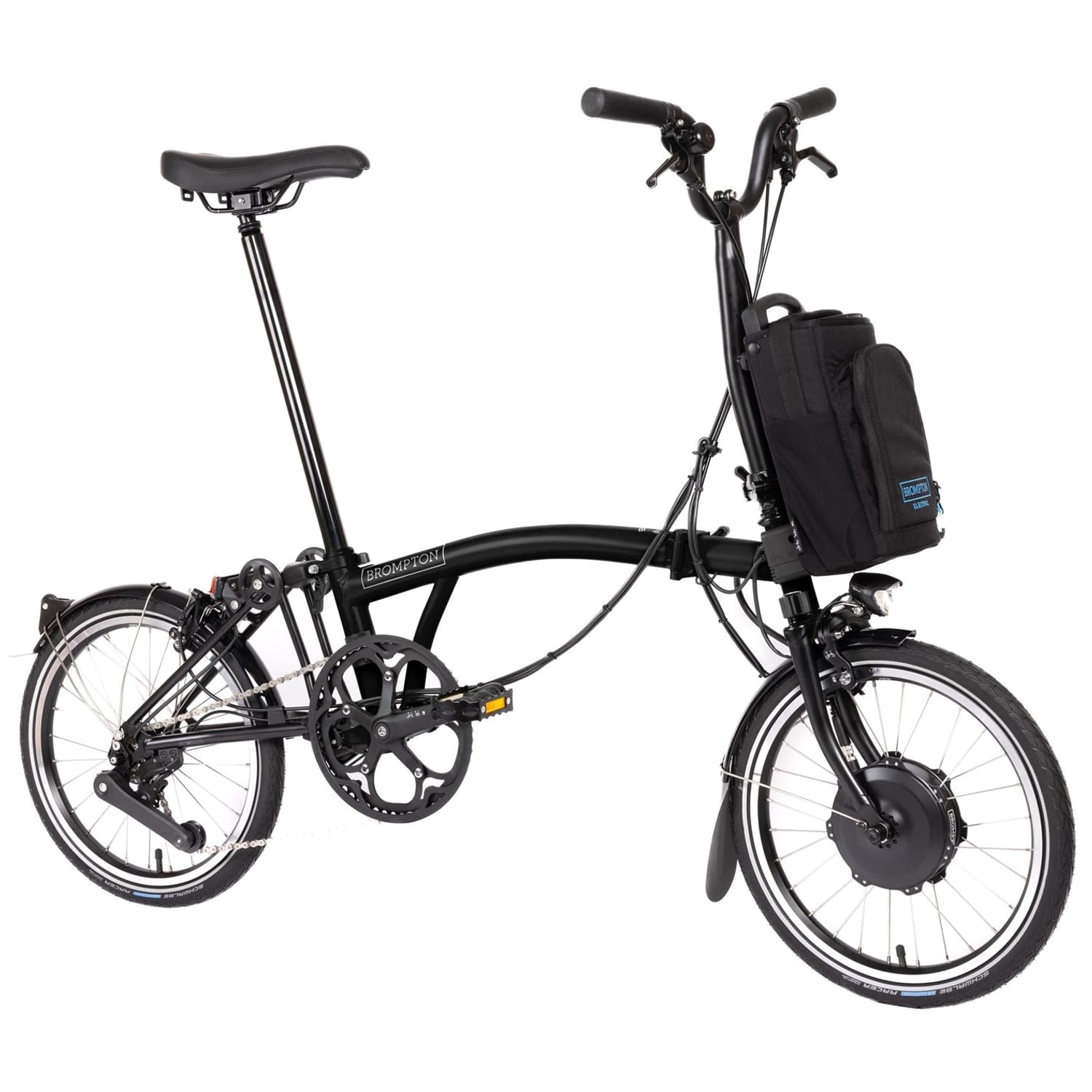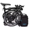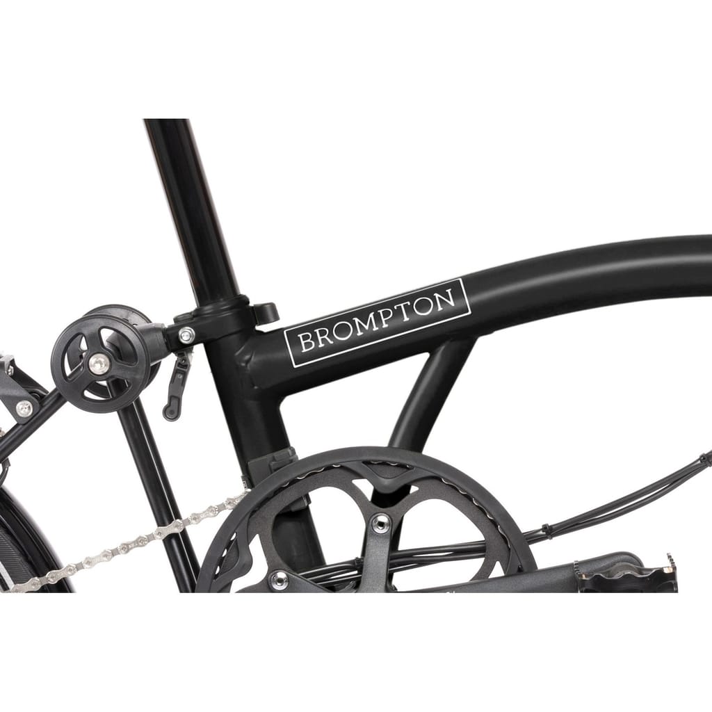 - Saddle: Brompton saddle with integrated carry handle (147mm). Incorporates a mount for a Brompton rear light and saddle bag.