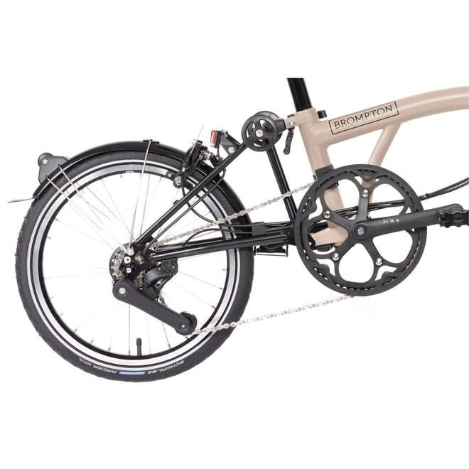 - Rear Wheel: 28 spokes laced to a Brompton Wide ratio 3 speed internal gear hub combined with 2 speed external gears (13 and 16 tooth). Giving 6 usable gears and a 300% gear range.