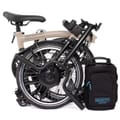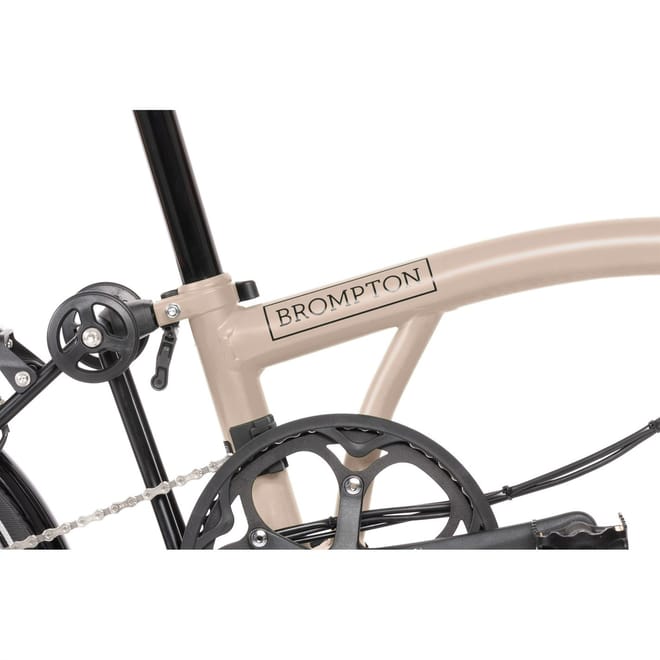 - Saddle: Brompton saddle with integrated carry handle (147mm). Incorporates a mount for a Brompton rear light and saddle bag.