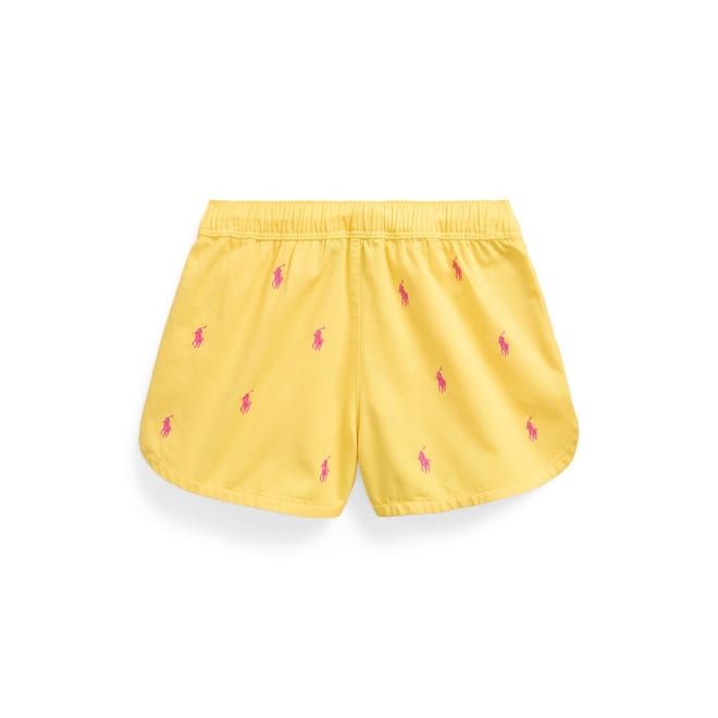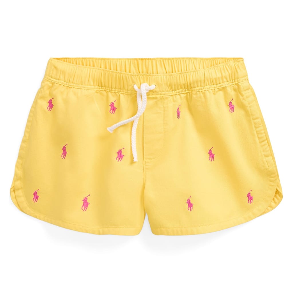 - Designed in yellow with an allover motif of the signature Pony embroidered in pink adding a fun, youthful touch to the style. Whether your youngster is at the beach or having a casual outing with friends, the Polo Ralph Lauren Logo Shorts are the perfect piece to accompany them. Pair with a crisp white t-shirt and sandals for a complete ensemble.