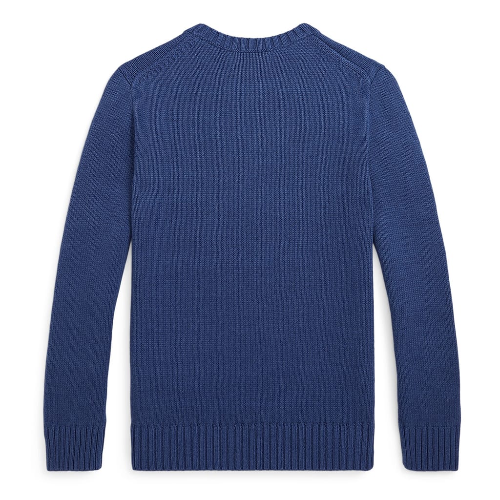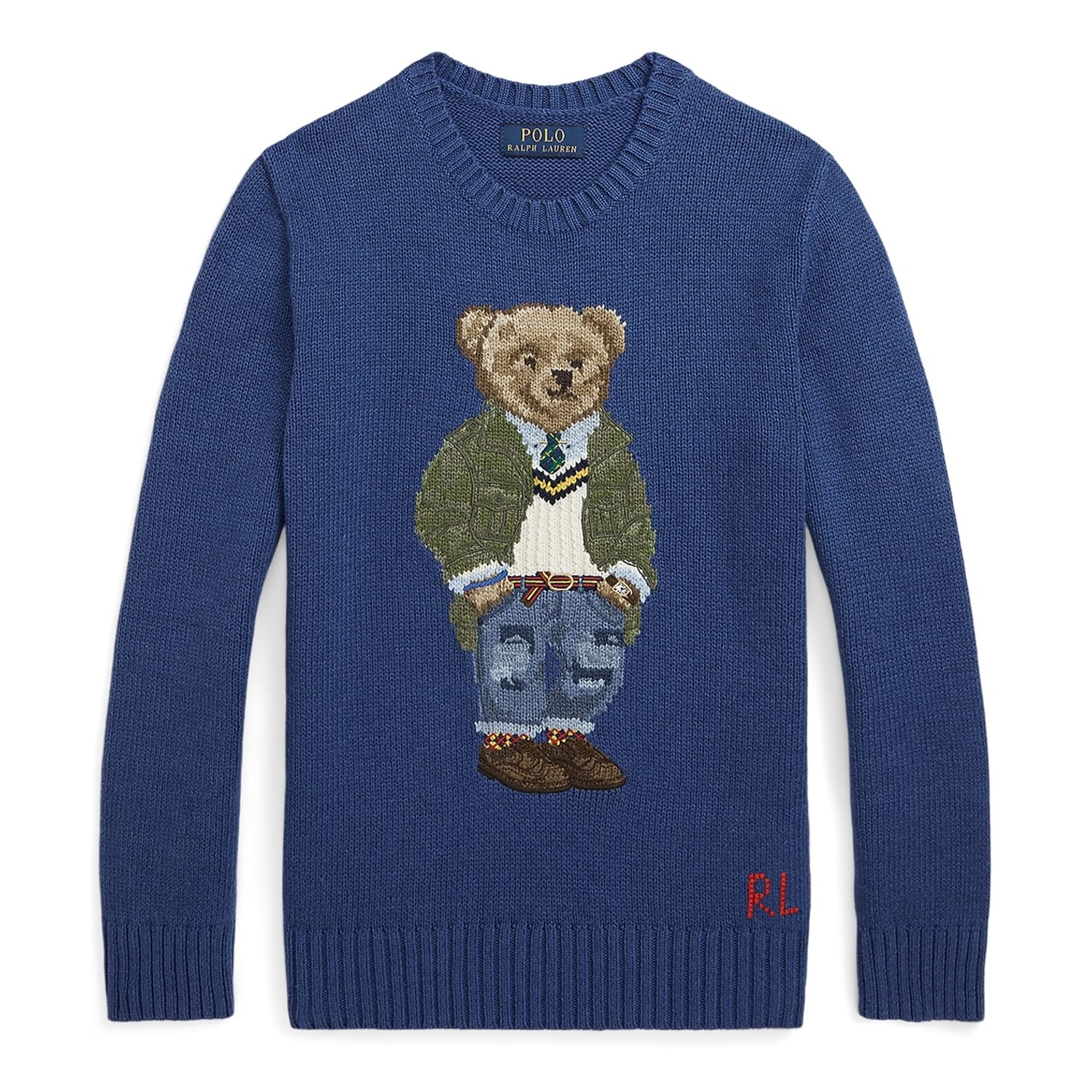 Add a playful and vibrant touch to your mini me's outerwear with the coveted Polo Bear Jumper from Polo Ralph Lauren Crafted from the finest 100% cotton, responsibly sourced through Better Cotton, in a fine knit composition this jumper exudes soft sophistication keeping your little one comfortable with its breathable feel, adding a layer of luxury to their daily dressing. With its versatile crew neck and long sleeves, this jumper effortlessly transitions from casual to dressy occasions. The ribbed cuffs and hem provide a snug fit while adding an extra layer of sophistication to this timeless garment. The iconic signature Polo Bear motif comes to life through the intricate intarsia-knit logo, adding a touch of whimsy and personality to this classic piece coming to a fun and prestigious finish that your little one will love.