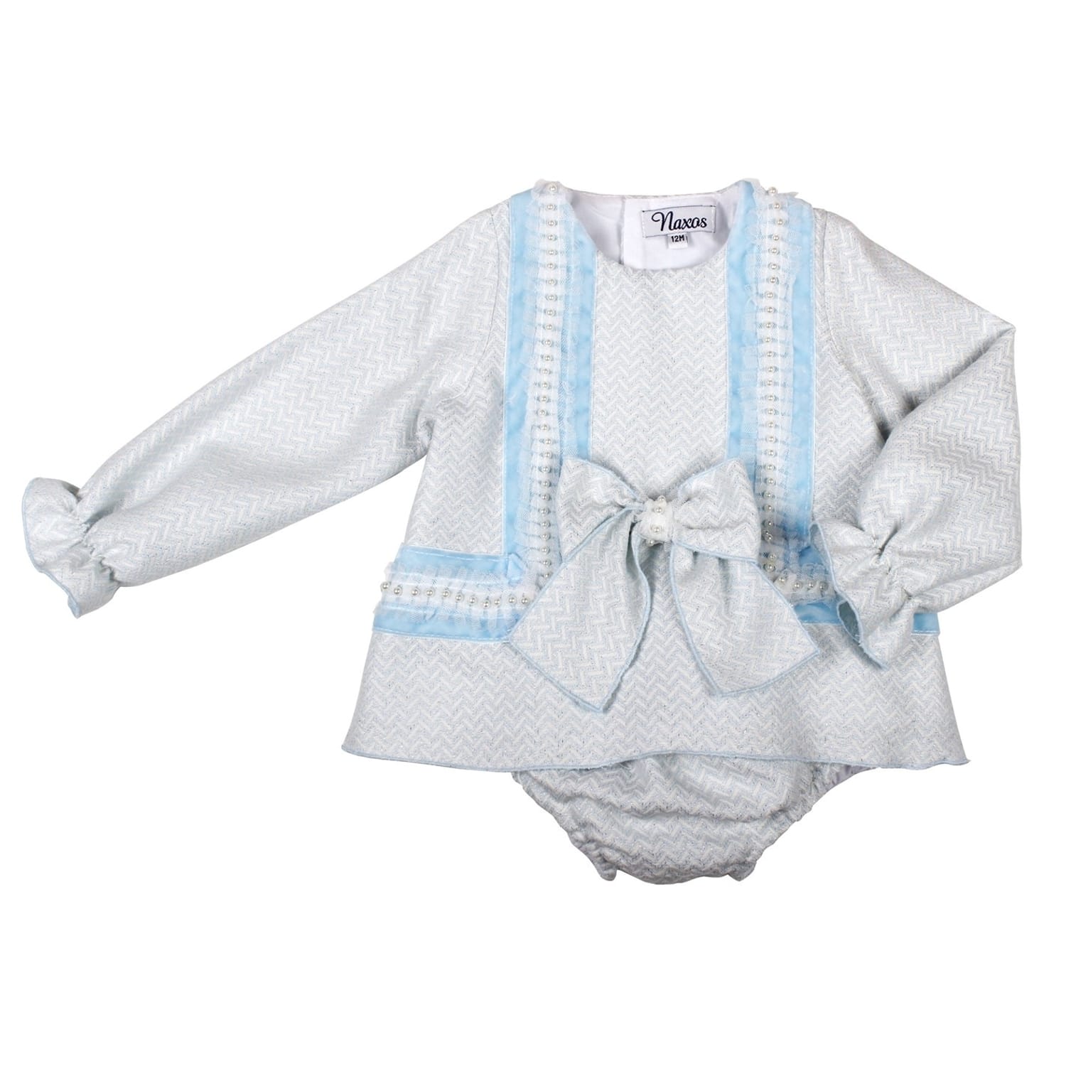 This Naxos dress features a relaxed fit and long sleeves for a comfortable, stylish look. The crew neck and herringbone pattern add a touch of classic elegance, while the bow and applique embellishments provide a unique, decorative detail. Perfect for various occasions, this dress combines traditional elements with modern flair. -