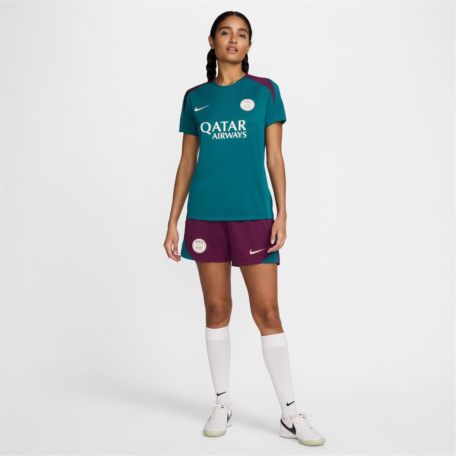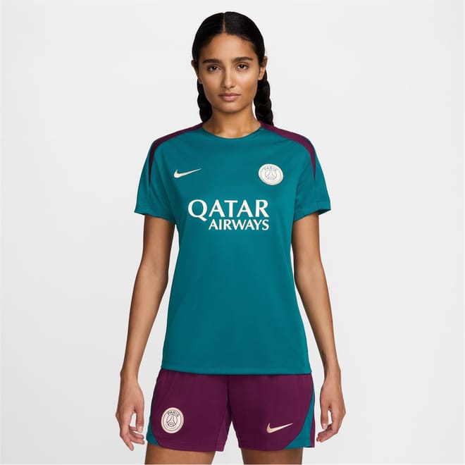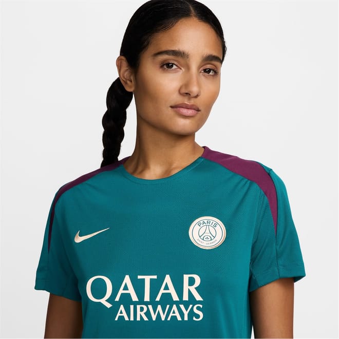 - The streamlined slim fit ensures unrestricted movement on the female body while the crew neckline and short sleeves offer additional comfort. The striking panelled colourway accent at the shoulders is complemented by the PSG team crest, giving this top a distinctive look that players would love to wear. Finally, the embroidered classic Nike Swoosh on the chest displays excellence and a declaration of loyalty to the brand. Wear it with pride, and join the global community of football enthusiasts.
