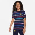 - Made with premium polyester fabric and equipped with Nike's innovative Dri-FIT technology, it keeps young athletes dry and comfortable, even during intense training sessions. With its relaxed fit and crew neckline, this shirt offers freedom of movement and a comfortable feel, allowing them to excel on the field. The vibrant striped pattern, featuring seven different colours, including the iconic hues of the French flag, truly showcases their dynamic spirit and national pride. The Cockerel woven on the chest, accompanied by the embroidered Nike Swoosh branding, symbolizes courage, determination, and the relentless pursuit of victory. Whether it's a competitive match, spirited training session, or an opportunity to show support for their favourite team, the France Academy Pro Home Pre -