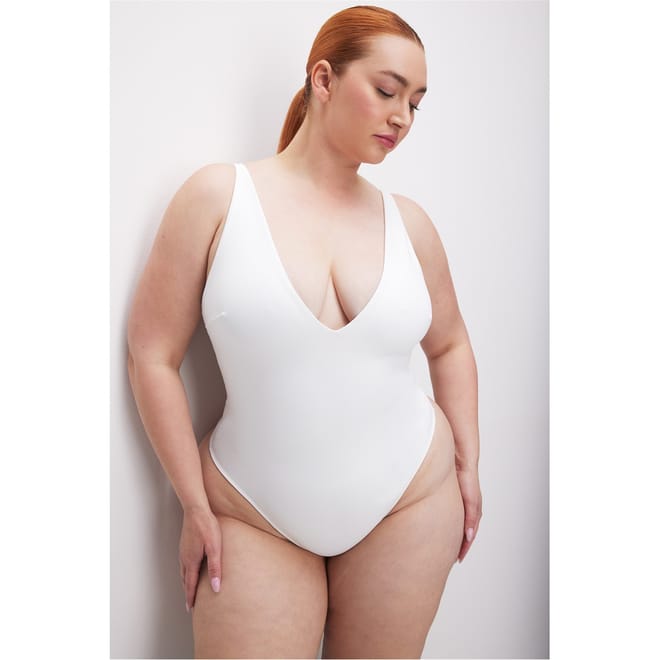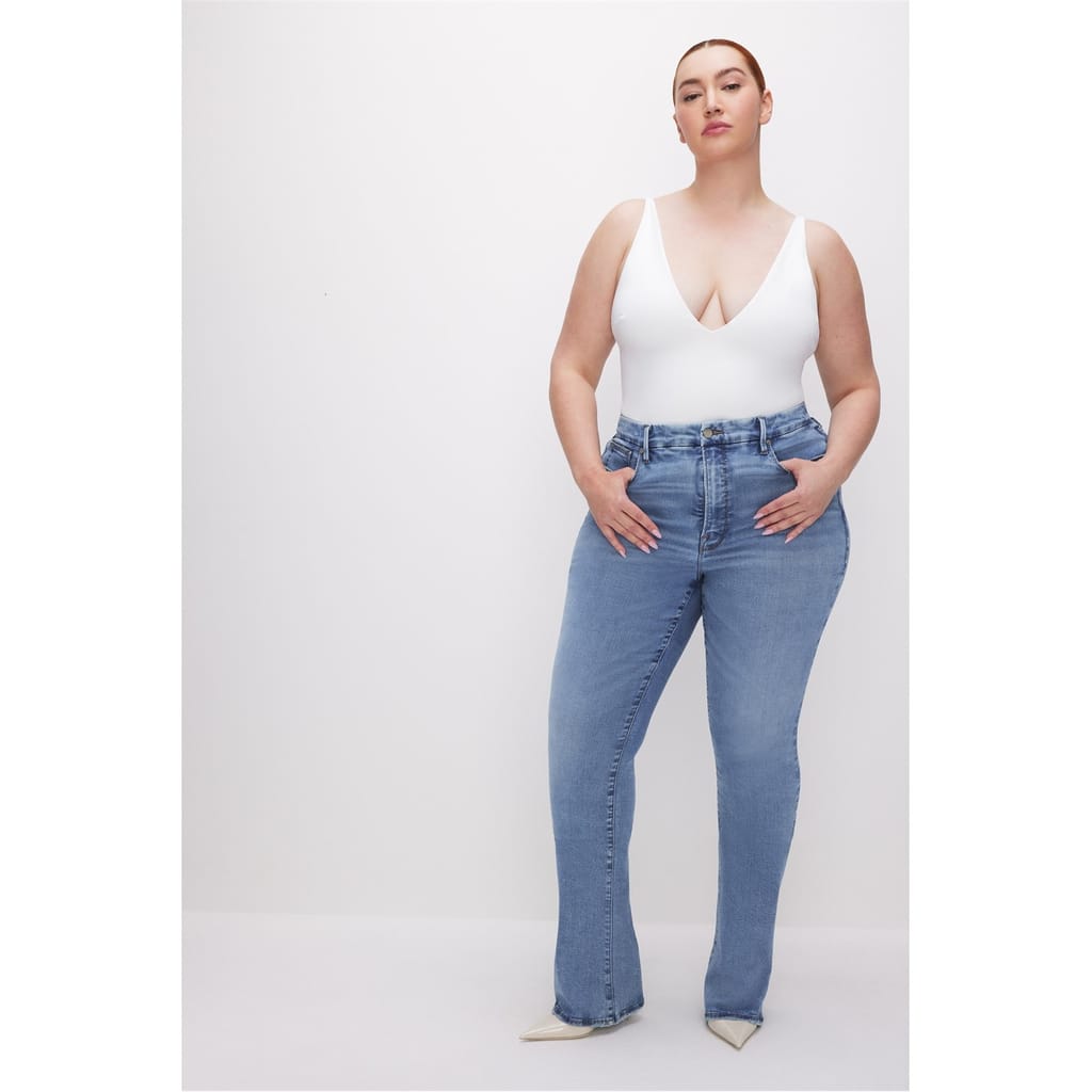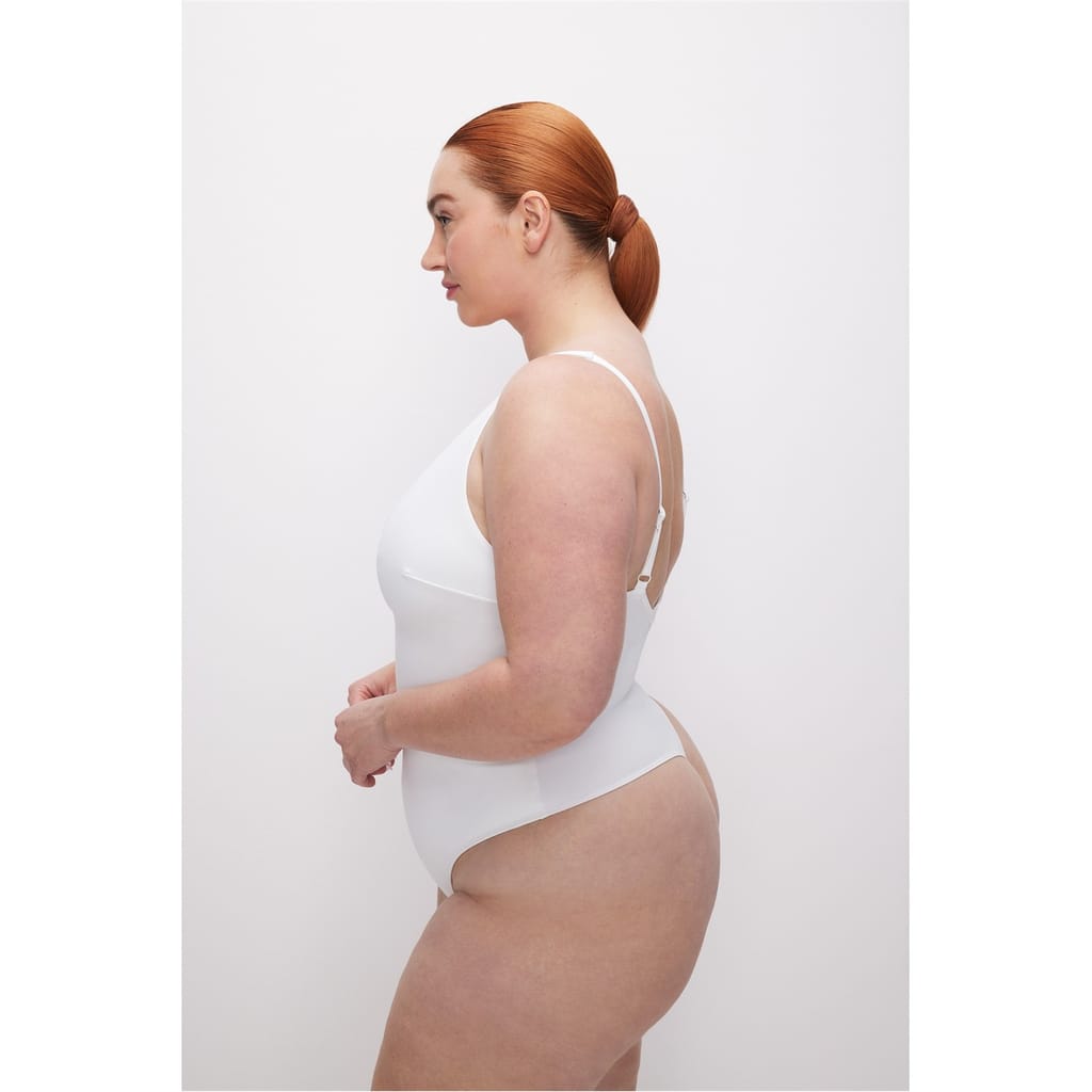 Discover the sleek elegance of the Good American tank top. This sleeveless, slim-fit camisole features a flattering V-neck and a solid pattern, making it a versatile addition to your wardrobe. Ideal for layering or wearing on its own, this top combines comfort with a stylish edge. -
