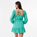 - With its mini length and tiered skirt, this dress presents a flattering silhouette that effortlessly flutters with every step. The gathered puff sleeves exude a sense of femininity and whimsy, further enhancing the dress's boho aesthetic. To add a touch of allure, the skinny tie detail at the back creates a subtle yet captivating focal point.
